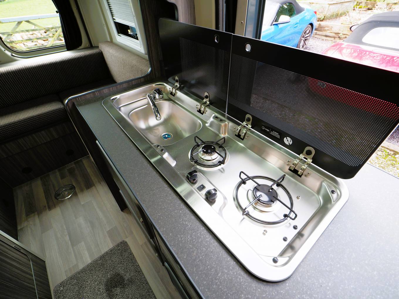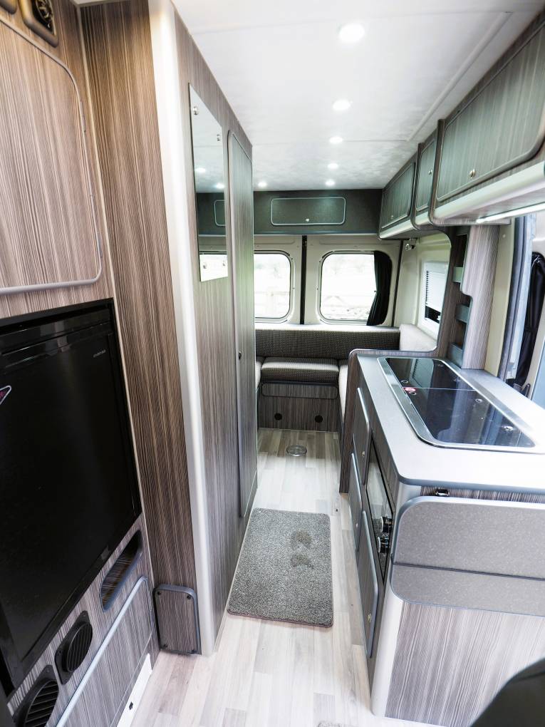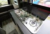 The kitchen has all you need to rustle up snacks or a full blown meal with a twin gas burner hob and built-in microwave. A sink with hot and cold running water and an extendable work surface sit alongside the hob and there is storage both above and below the counter top. Opposite is a 12v fridge.