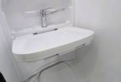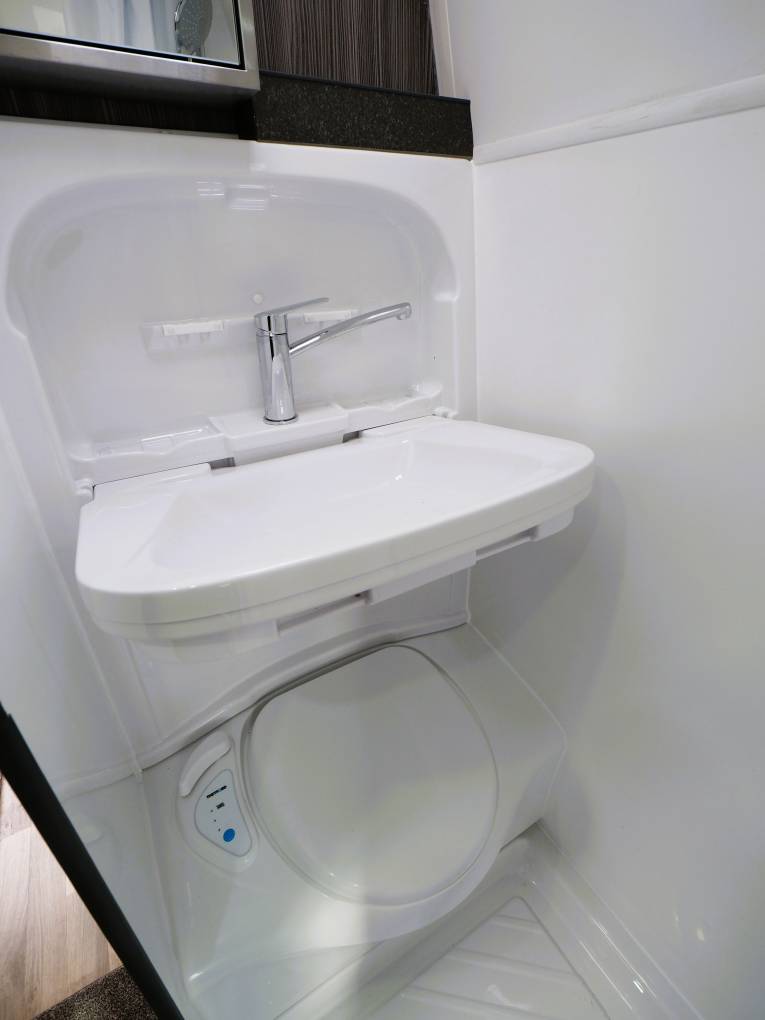 Home from home comforts with a built in wash room with flushing cassette toilet, drop down sink with mixer tap and a shower. A mirrored cabinet provides storage.