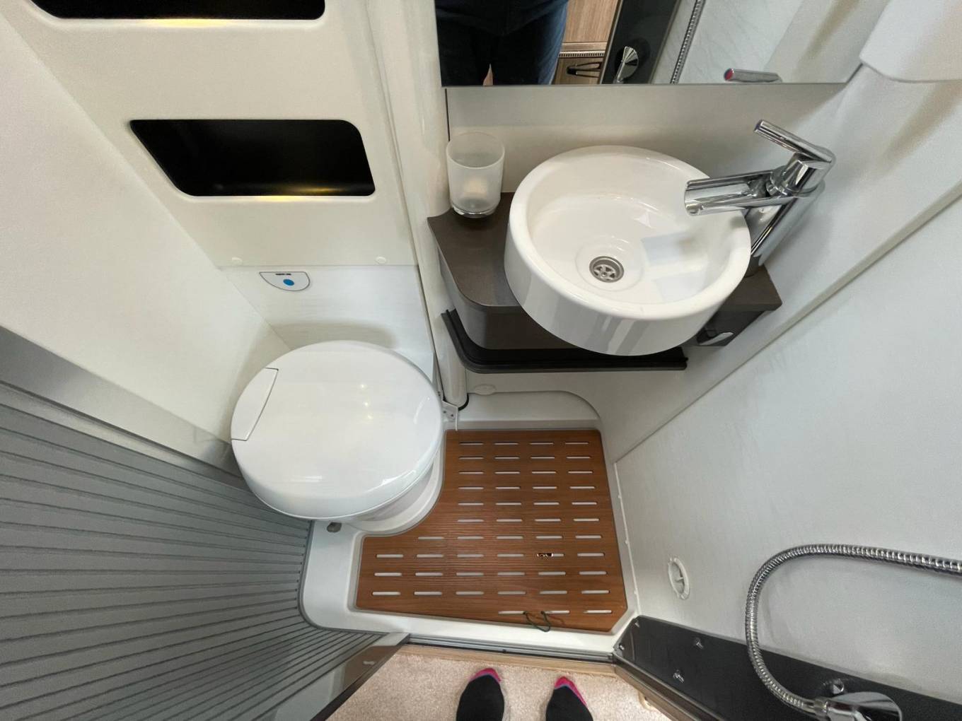 washroom is surprisingly spacious and laid out so that the sink, toilet and