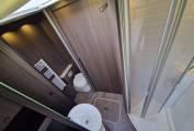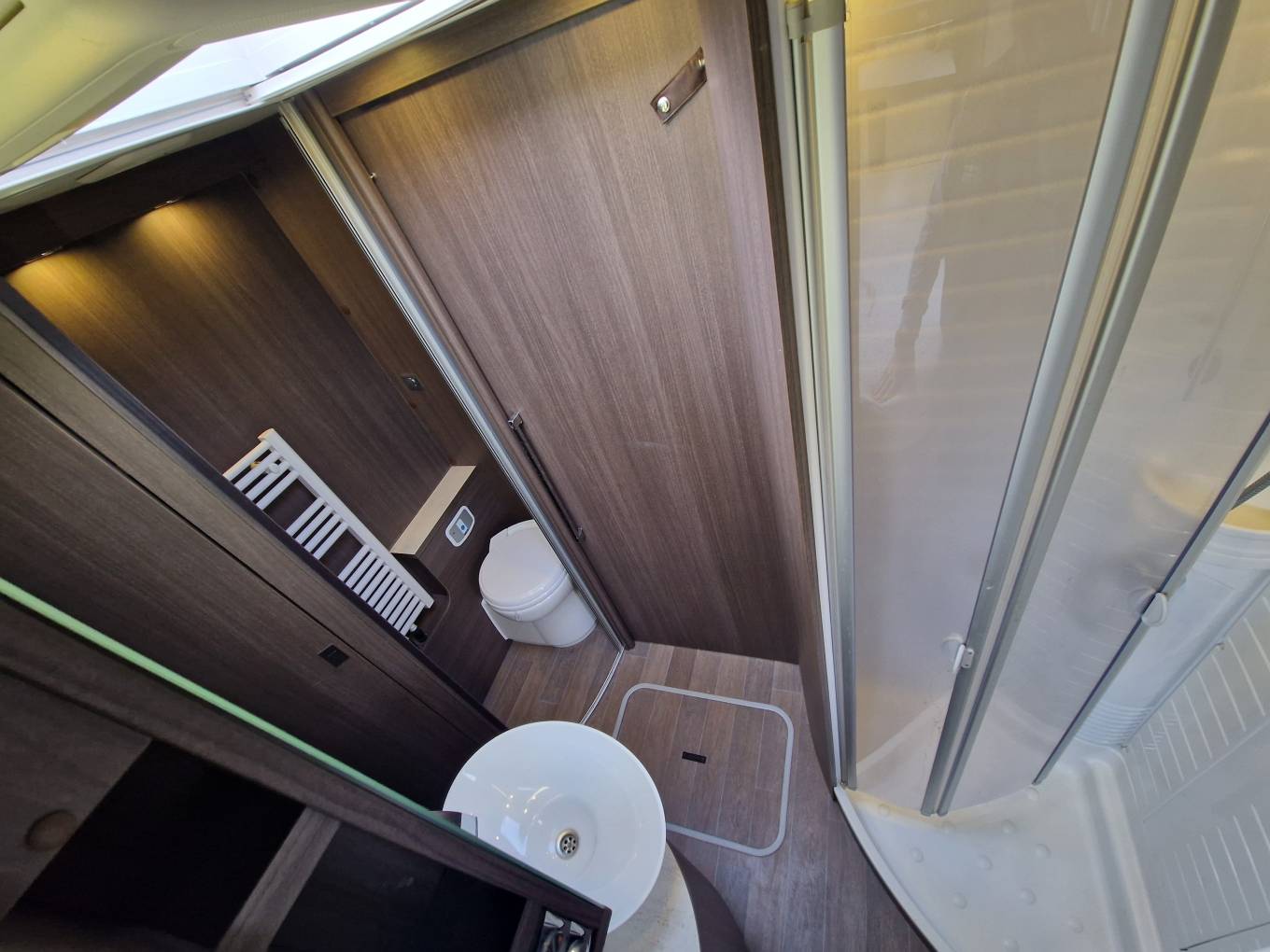 basin. On the left hand side is the Thetford toilet with an electronic flush