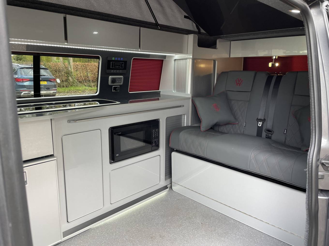 steps it has a beautiful interior trim of grey leather picked out with red
