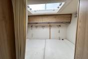 The rear bedroom has a fixed transverse bed with a foam mattrress so you don't have the hassle of making up and putting away the bed each day. There are numerous bedroom storage lockers and the large skylight opens to allow a summer breeze in.