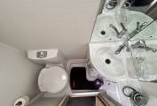 Opposite the kitchen is the washroom and here you have a shower, a wash basin with a mixer tap, a Thetford cassette toilet, a large mirror and a bathroom cabinet for your toiletries.