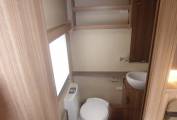 Towards the rear of the vehicle is a sleeping area with a double French bed, and across the back of this motorhome is a bathroom with a toilet, a hand basin, and a shower cubicle. The rear bedroom and bathroom can be screened off for privacy.