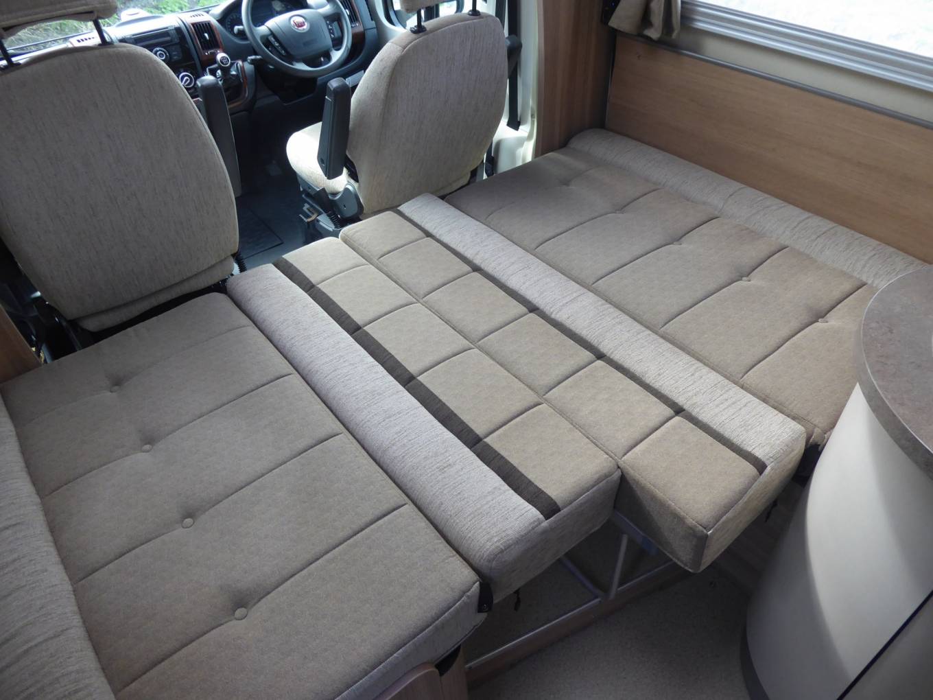 Behind the cab, the light and airy forward habitation leisure/dining area is comprised of opposing side sofas that can be enhanced by the use of the two swivel cab seats. The main seating can be configured to form a transverse double bed.