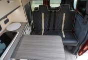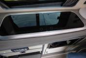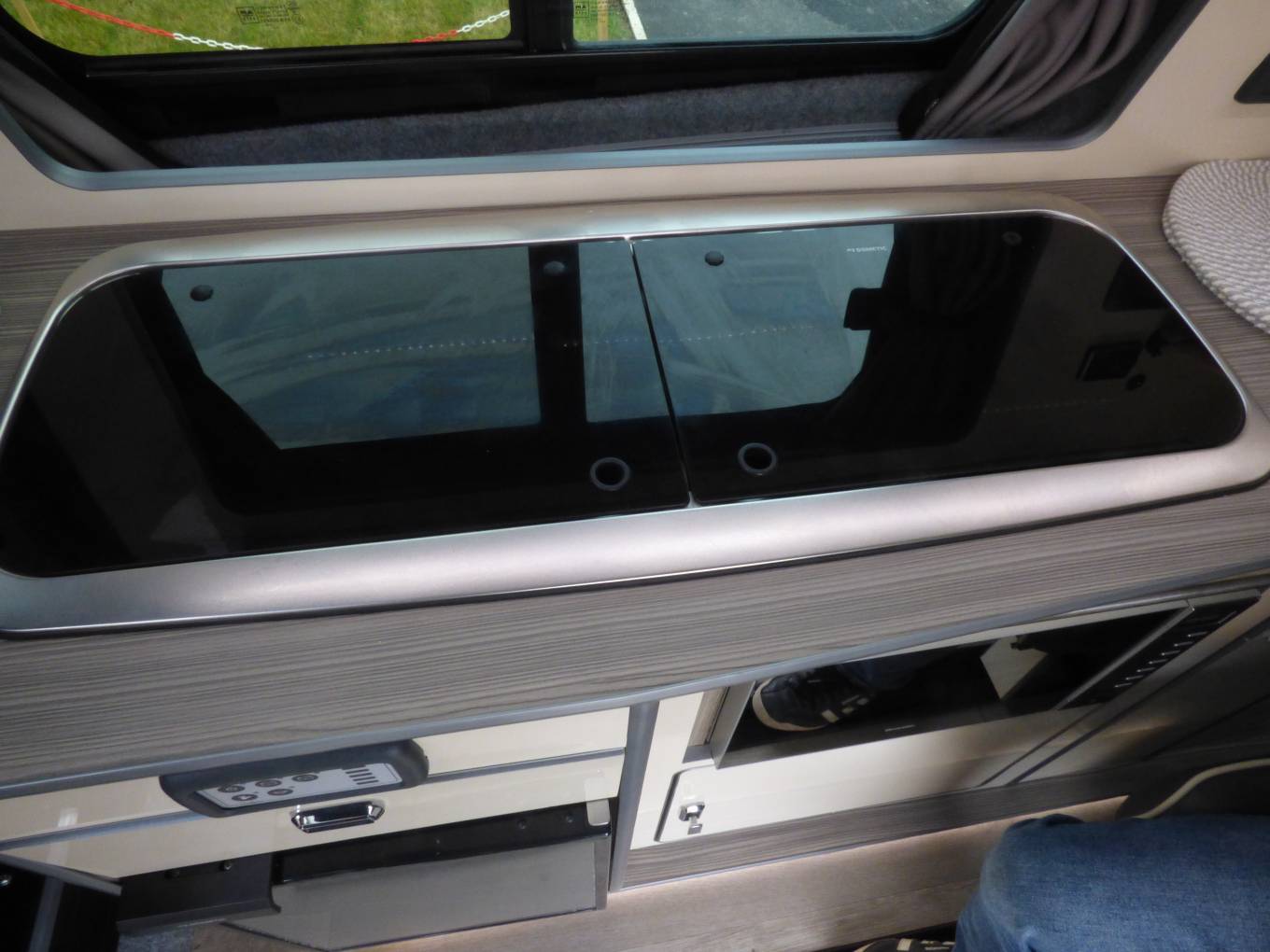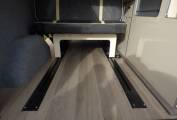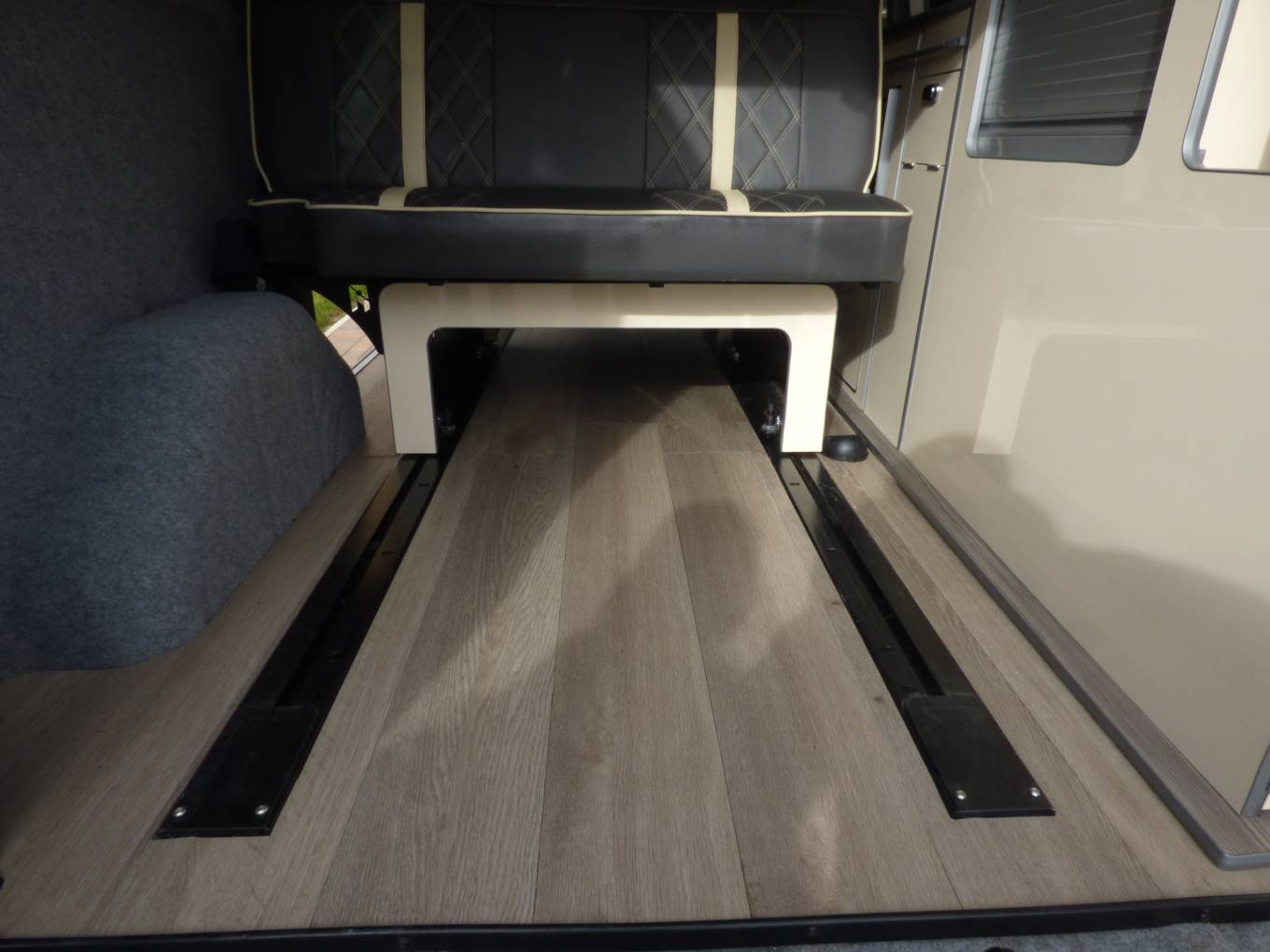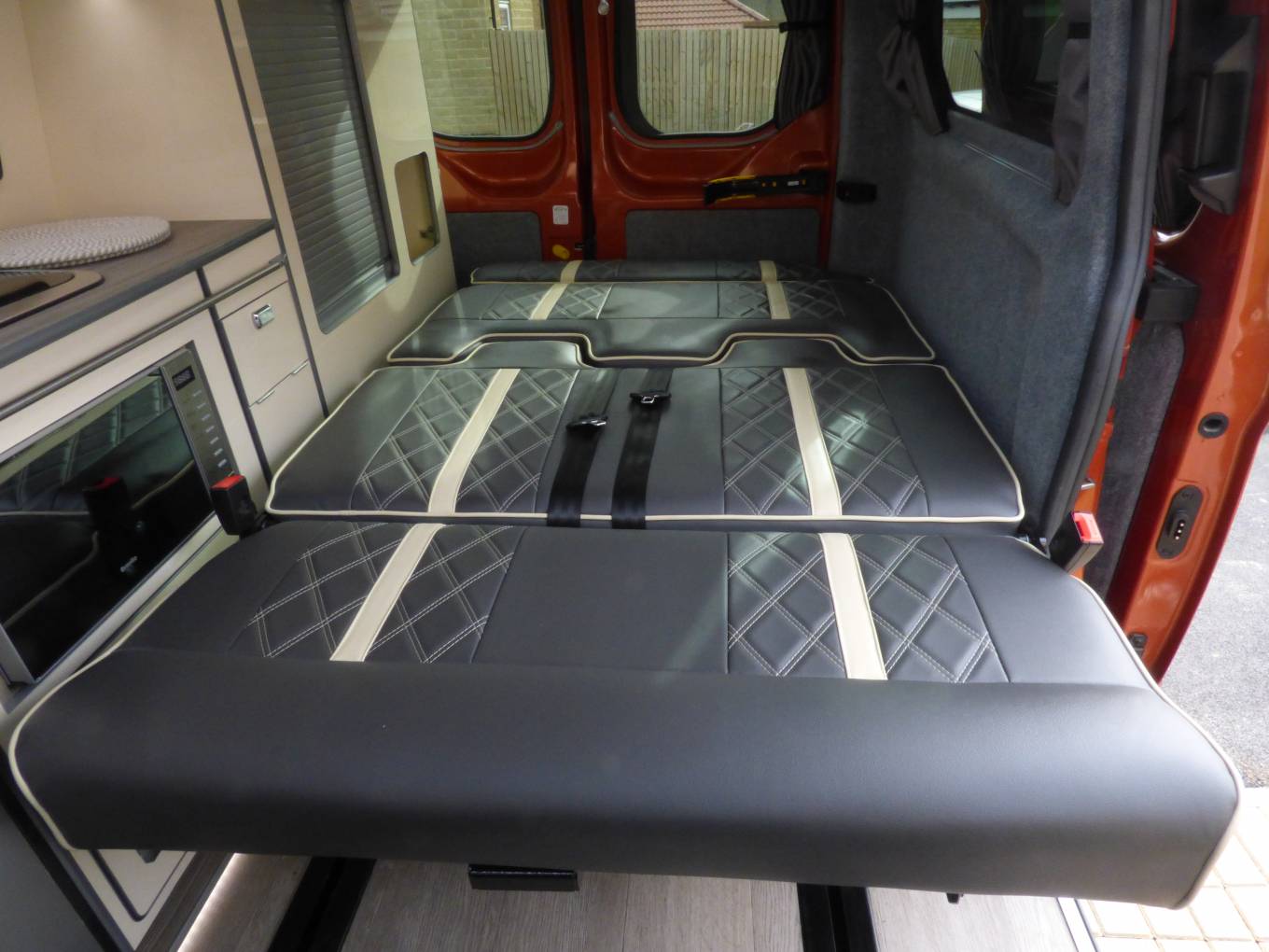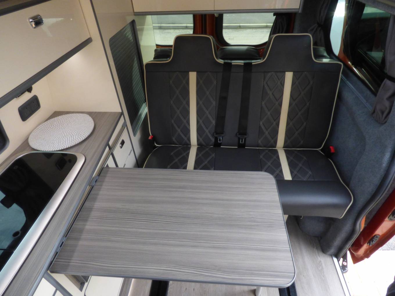 The habitation is top quality with runners which enable the rock and roll bed to be positioned just behind the front seats (more of a car format than having the rear seats miles behind) and this provides much more storage capacity behind the rear seats. A Webasto heating system keeps the van warm, a Dometic hob and a microwave, fridge, sink and electric water pump ensure the kitchen area is fully functional. The pop top roof with side and front "windows" in the lining keeps the van light and airy when the top bed (with foam mattress) is not in use. The single front passenger seat turns to face the habitation.