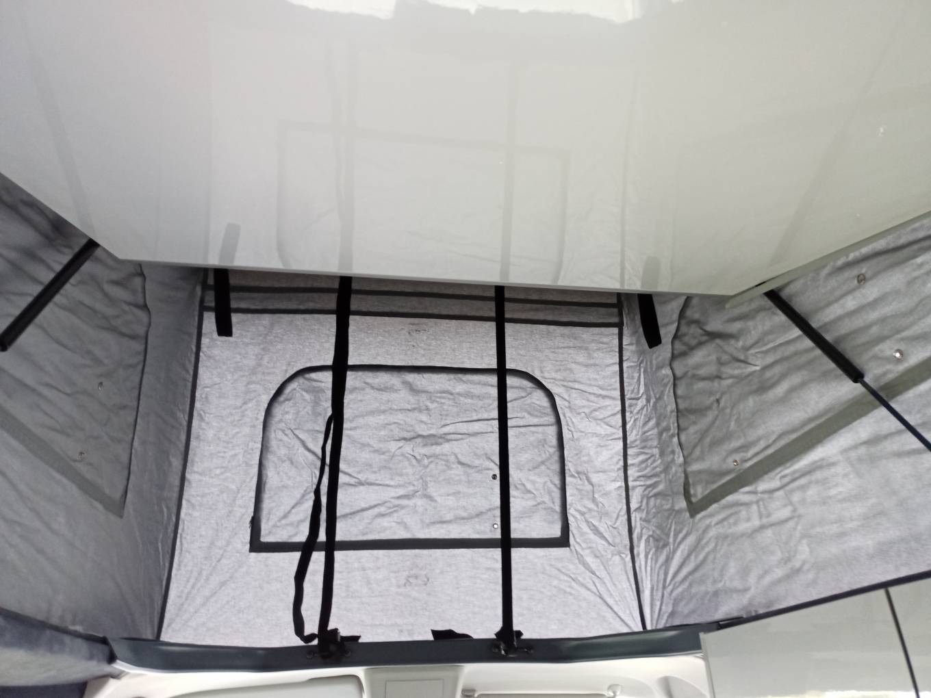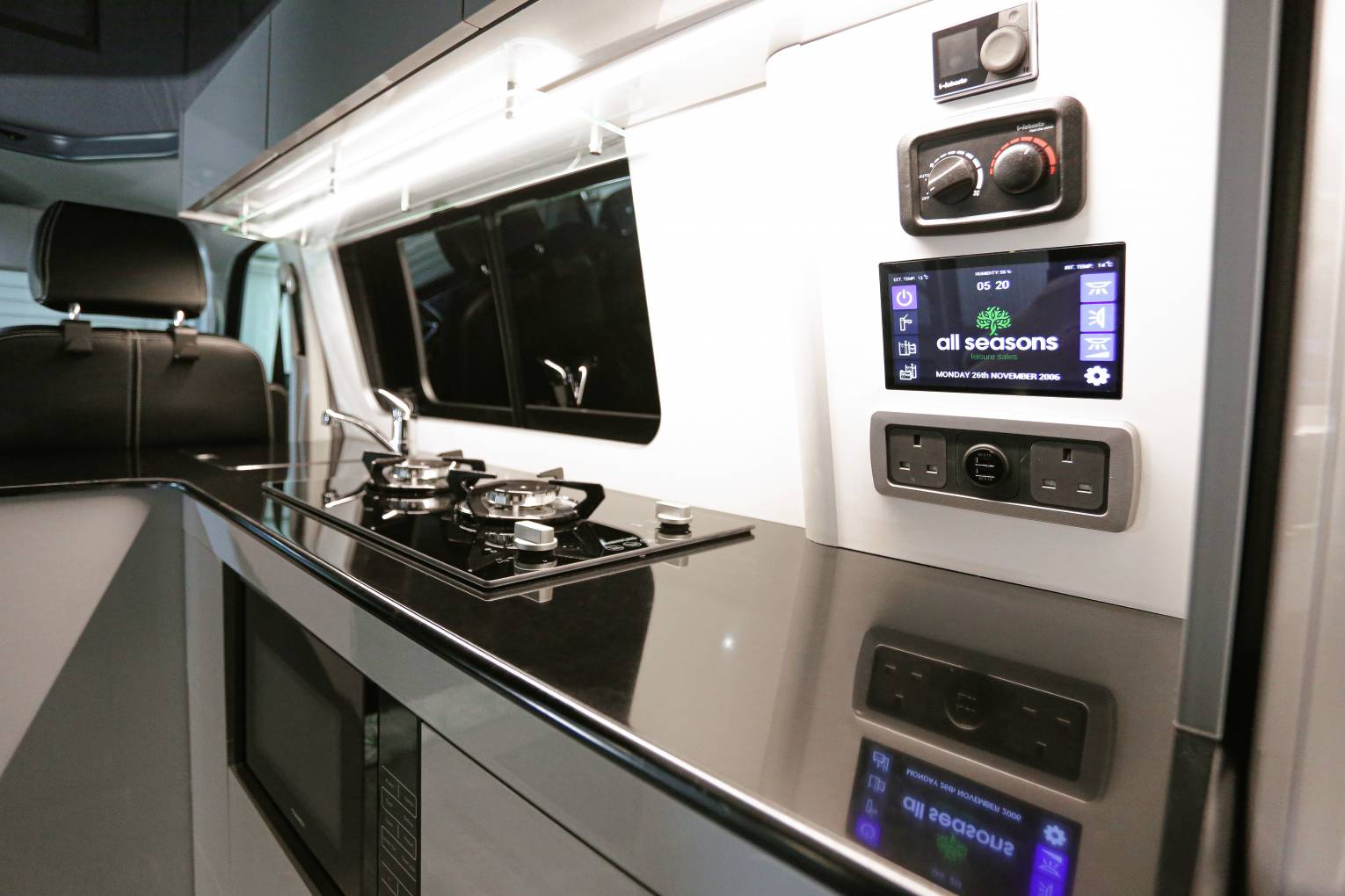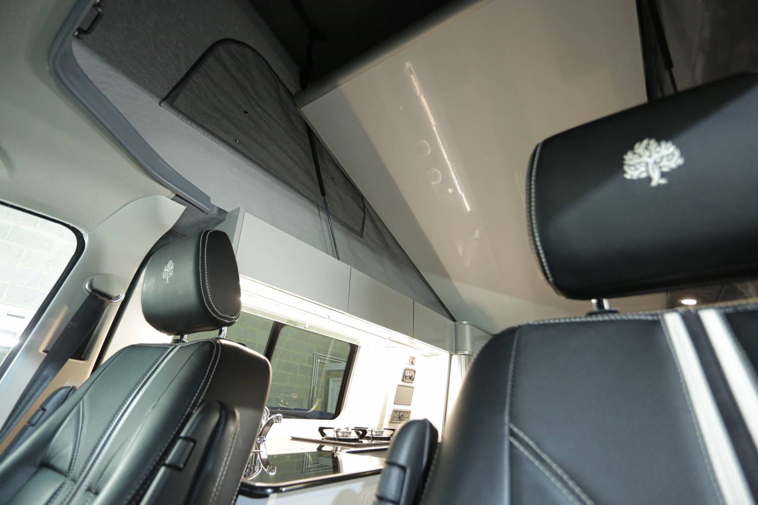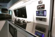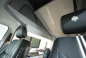The internal fittings sport slatted sliding cupboard doors, shiny laminate to the cupboards , work surfaces, and roof, multiple LEDs, and a proper social space for three to four. There is a diesel space heater fitted. Both cab seats swivel, the driver side to face sideways.