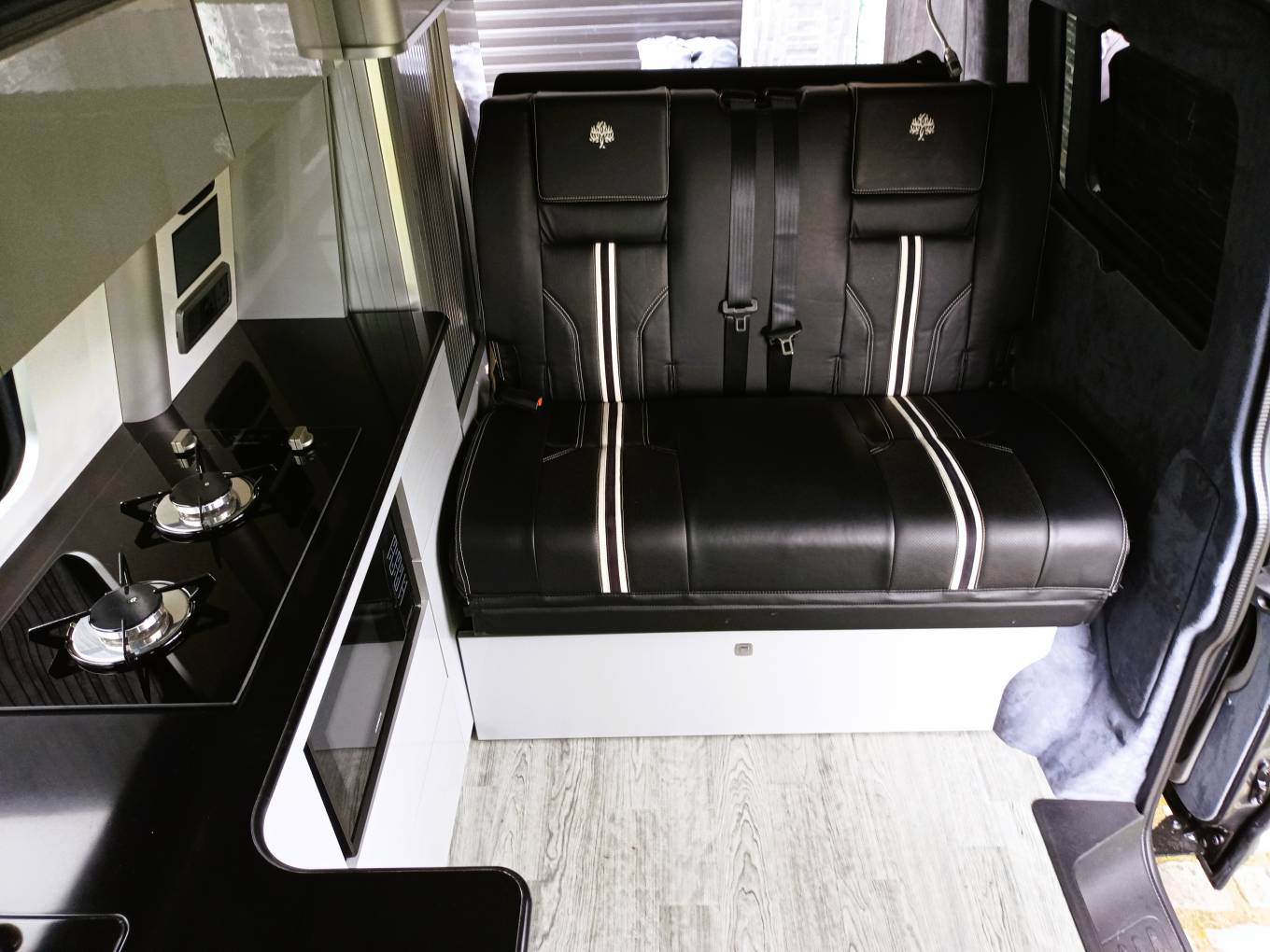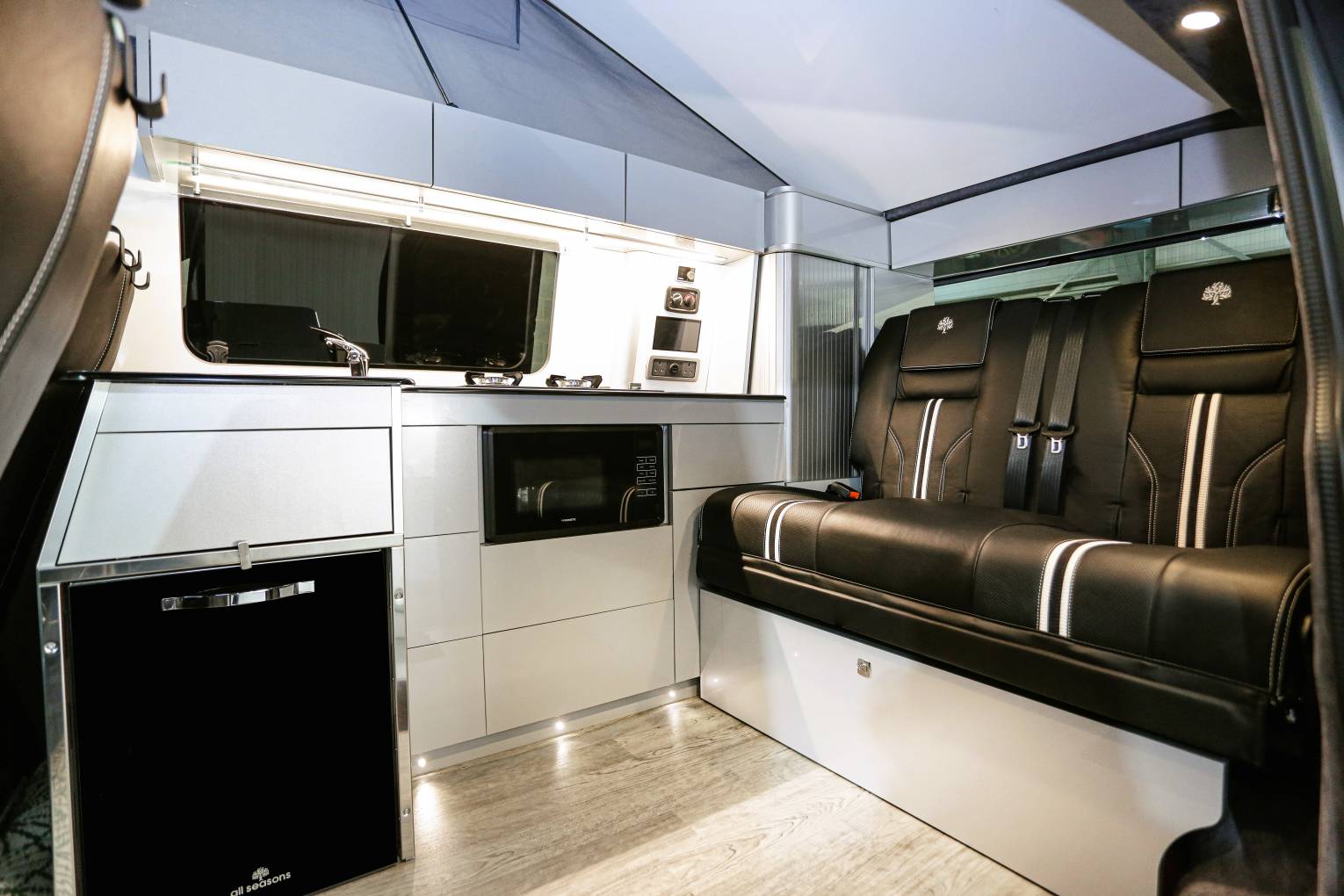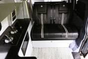 Four belted leather seats, rock and roll bed, and pop top with memory foam mattress and two more berths.