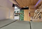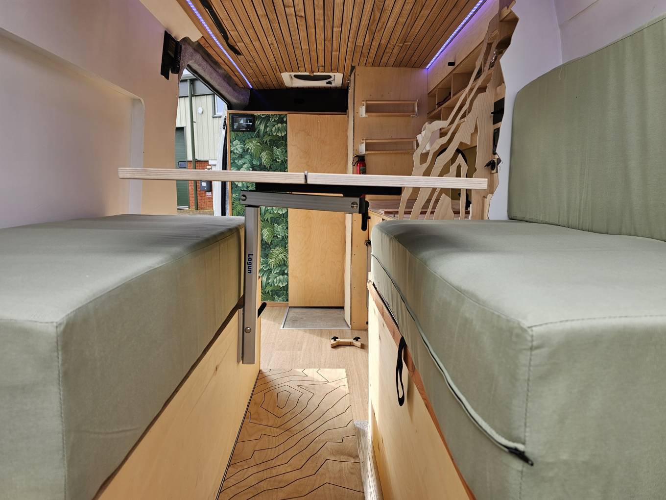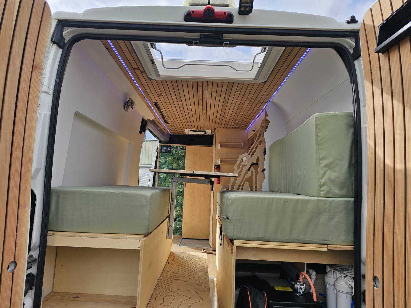 Within the centre mounted power/electrical services cabinet is the brains of the van. This installation is worth several thousand pounds and consists of 2 x 110AH Lithium-ion batteries, Victron power management devices, 1600w continuous 3000w peak @ 15 mins inverter and proper marine/leisure vehicle grade fuses, RCDs and connectors along with a Victron solar controller. The roof mounted solar panels are 295w each and on an average day weather wise push out 20amps with ease. So you will be hard pushed to run out of power.