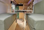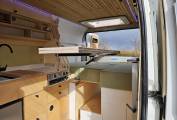 To the right of this is the well fitted out kitchen with retro looking cabinetry and plenty of drawers. There is also a concealed gas hob and Tasman under counter grill along with a 12v absorption fridge. There are also lots of sturdy shelves and cubby holes for all of your kit.