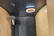 Stepping into the habitation area is the shower directly ahead of you. This has high quality fittings along with a resin based waterproof floor. There is an extractor fan with dual lighting controls for nighttime use with subtle red light or bright white LED in conjunction with the fan while showering.