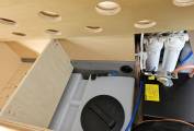 We then have the well thought out bed design which easily turns from dining or chilling for 4 into a good sized ultra comfortable double bed. Under the one is the water tank and gas locker. In the middle at floor height is the power services cabinet with scribed hinged lid to allow access to batteries and fuses. On the other side is more storage space, featuring a 1m pull out longitudal drawer with removable lid for shoes and other kit..
