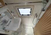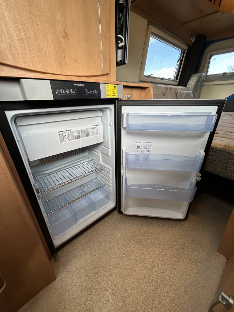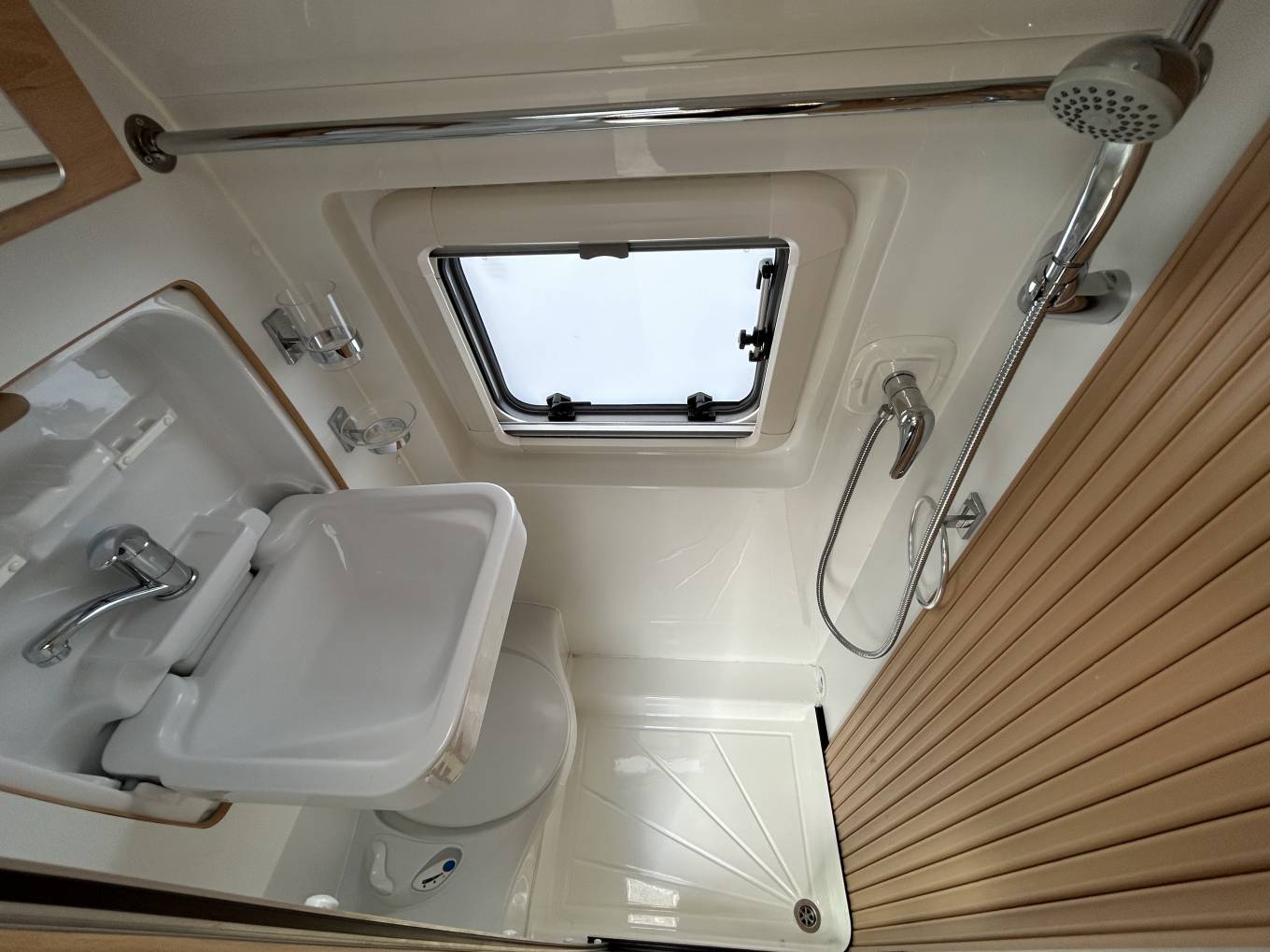 Moving to the centre of the motorhome you have a kitchen area fitted with an oven/grill combi, fridge with small freezer, hidden sink in draw giving plenty of countertop space. Across from here is a spacious washroom fitted with a shower and tray, drop down basin and a toilet cassette.