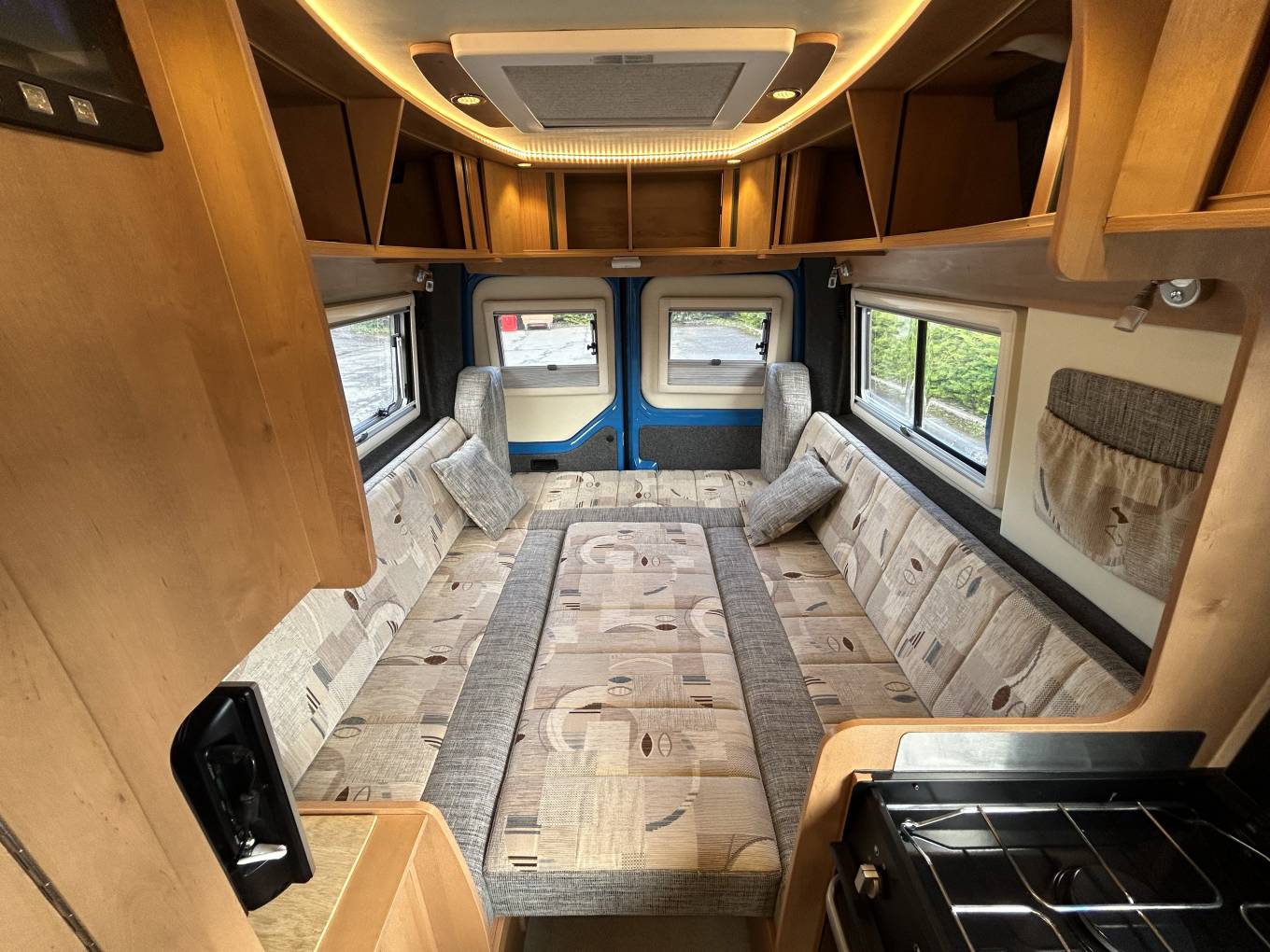 For the layout starting from the back we have a Large rear U-Shaped lounge in fantastic condition which doubles up as a large double bed. Lots of storage around the roof area and a perfect place to relax in front of the TV or a meal on one of the 4 removable tables. On an evening, removing the rear cushion which has been reinforced, sliding it into the centre of the lounge area, the bed can be ready in the less time than it takes to boil the kettle!