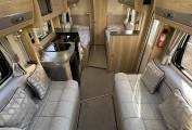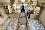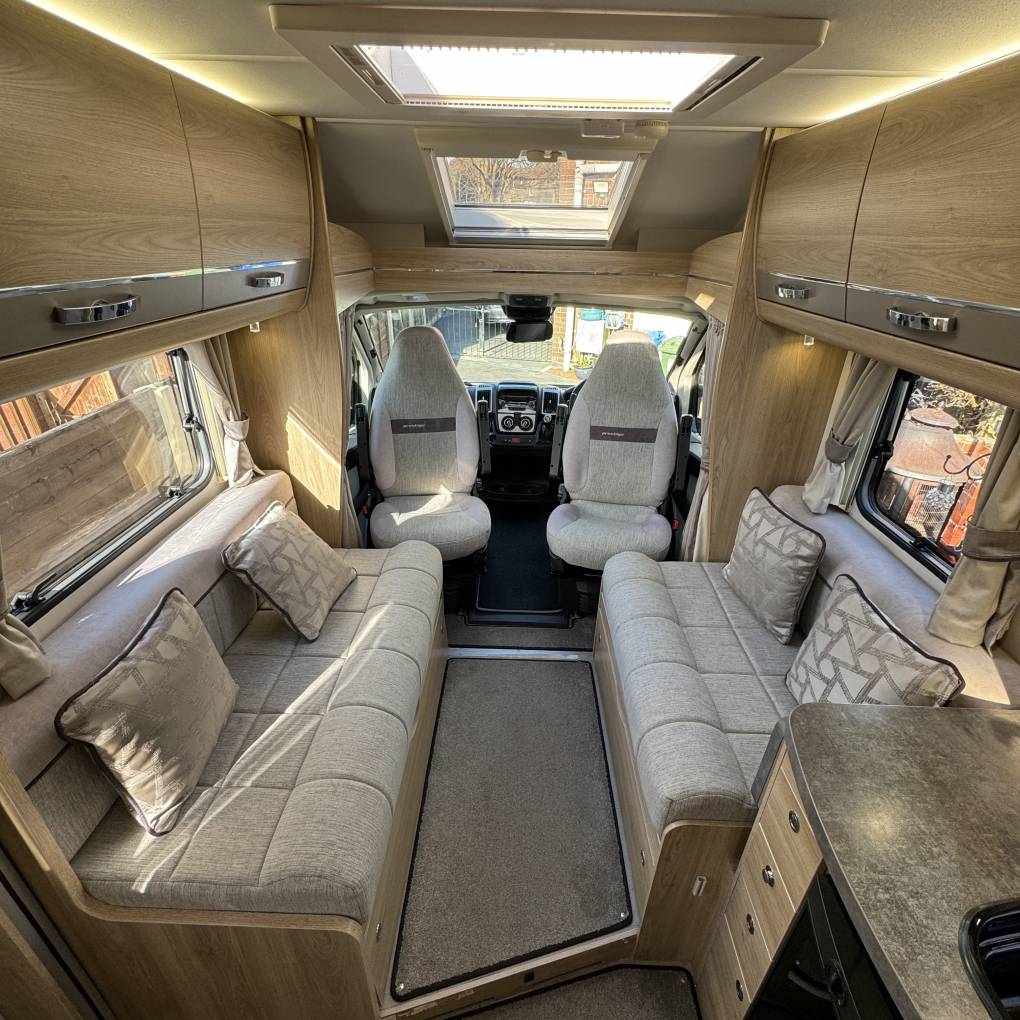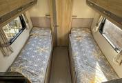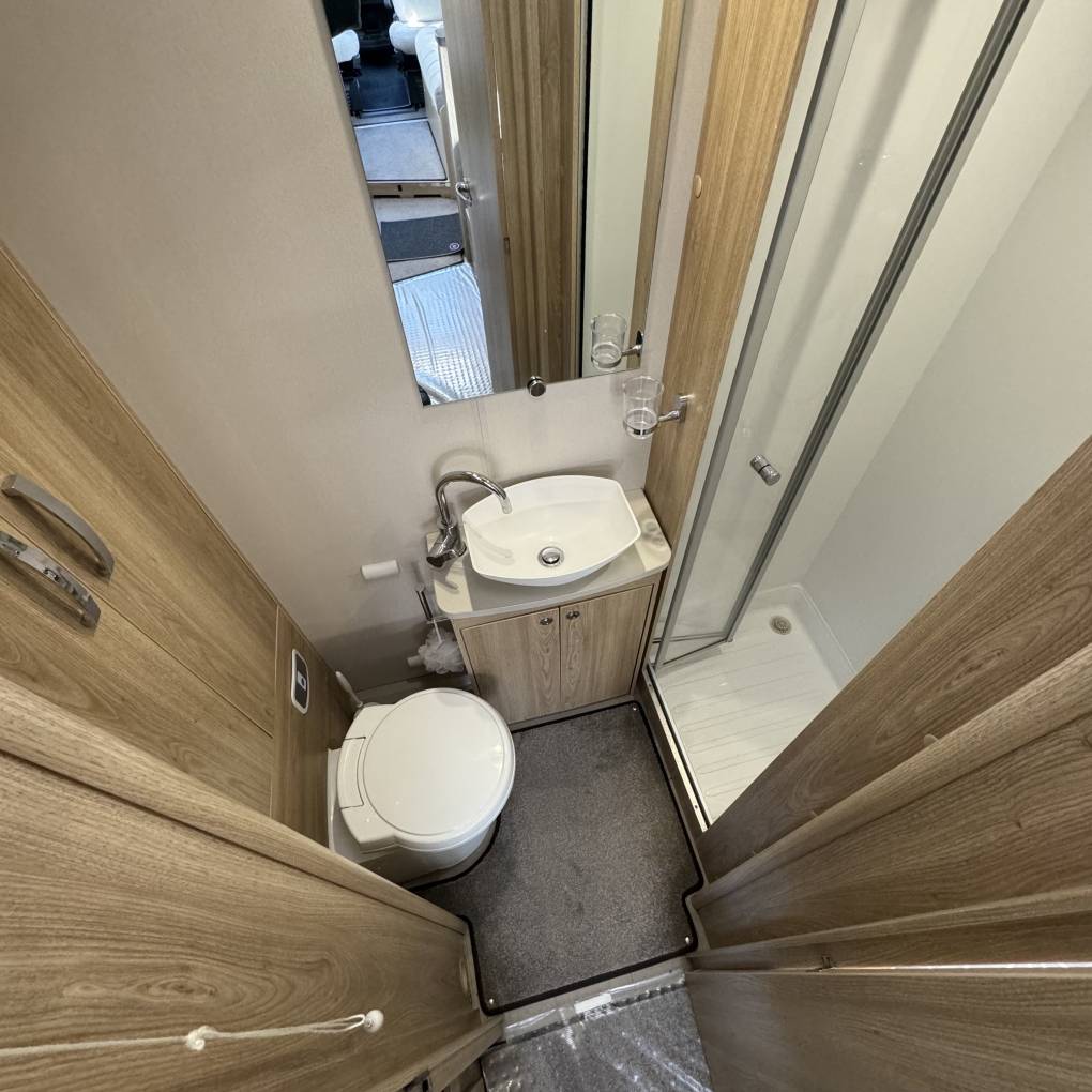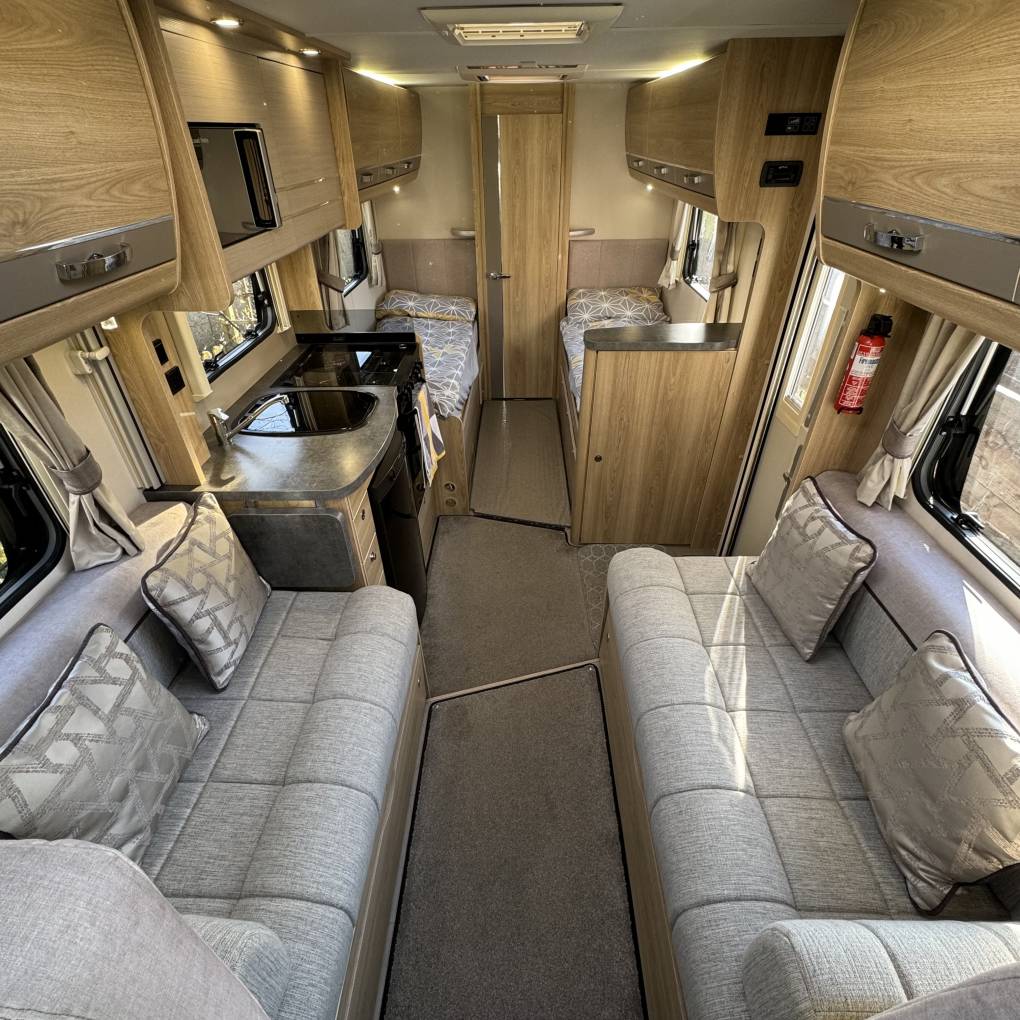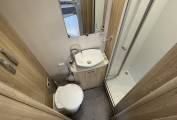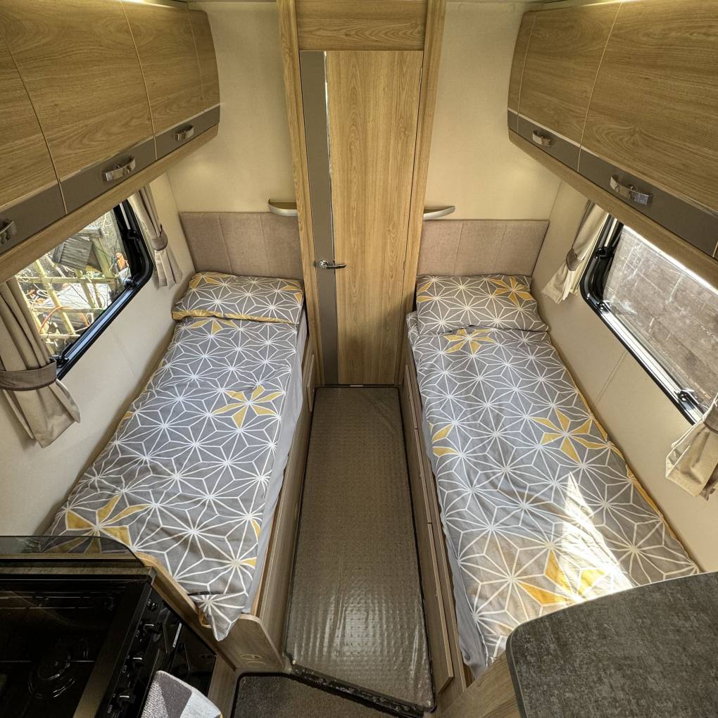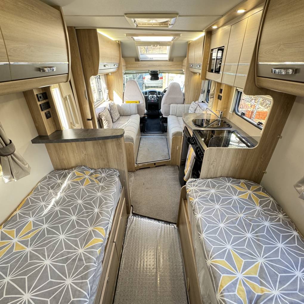 Starting at the rear you have your spacious washroom which is the full width of the vehicle and comes complete with toilet cassette, hand wash basin, separate shower cubicle and great storage space. Just out of this area you have your 2 fixed single beds with yet more good overhead storage space.