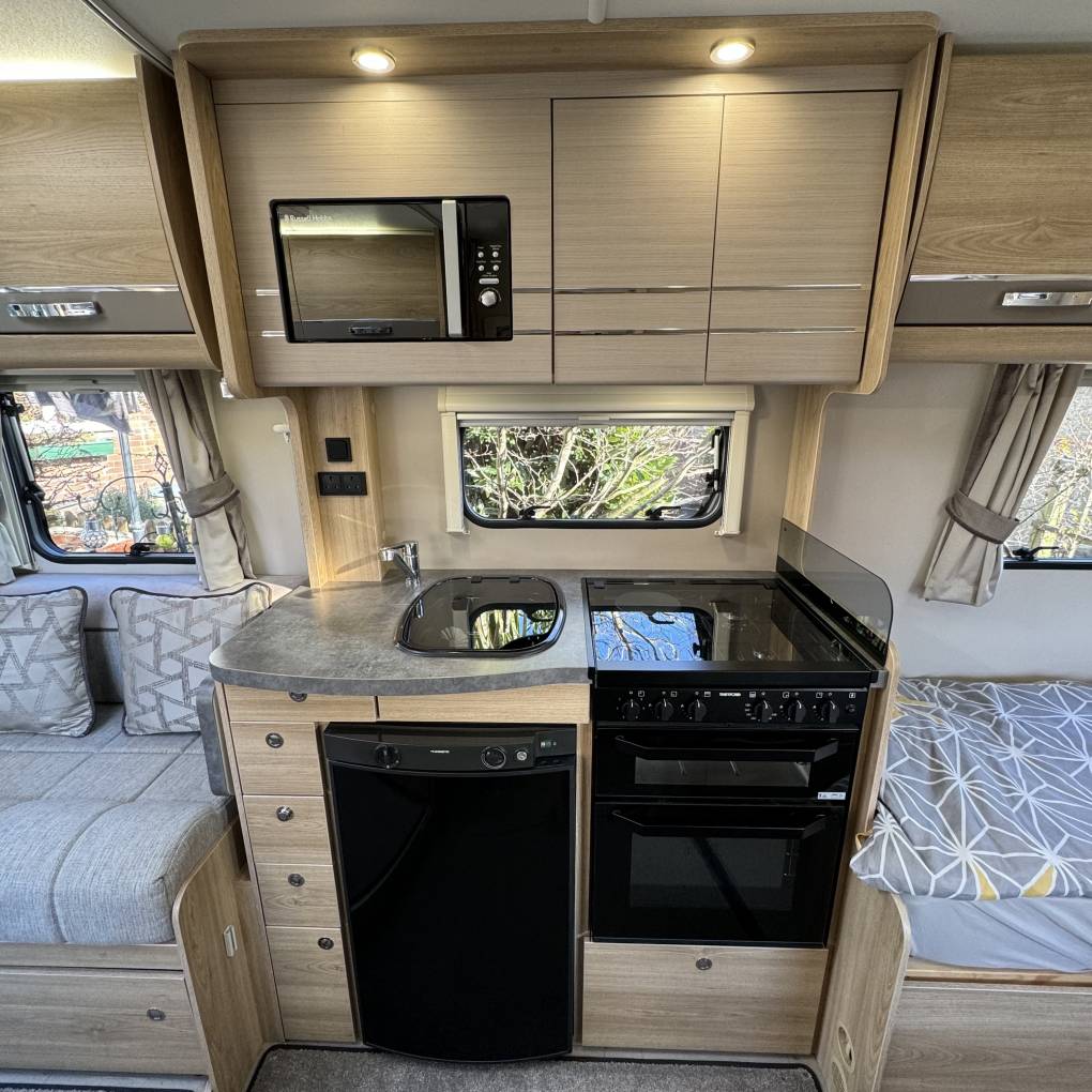 Moving into your fully equip kitchen you have a full oven with grill, electric and gas hob, microwave, sink with tap, 3 way fridge and storage space throughout.