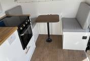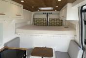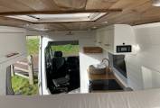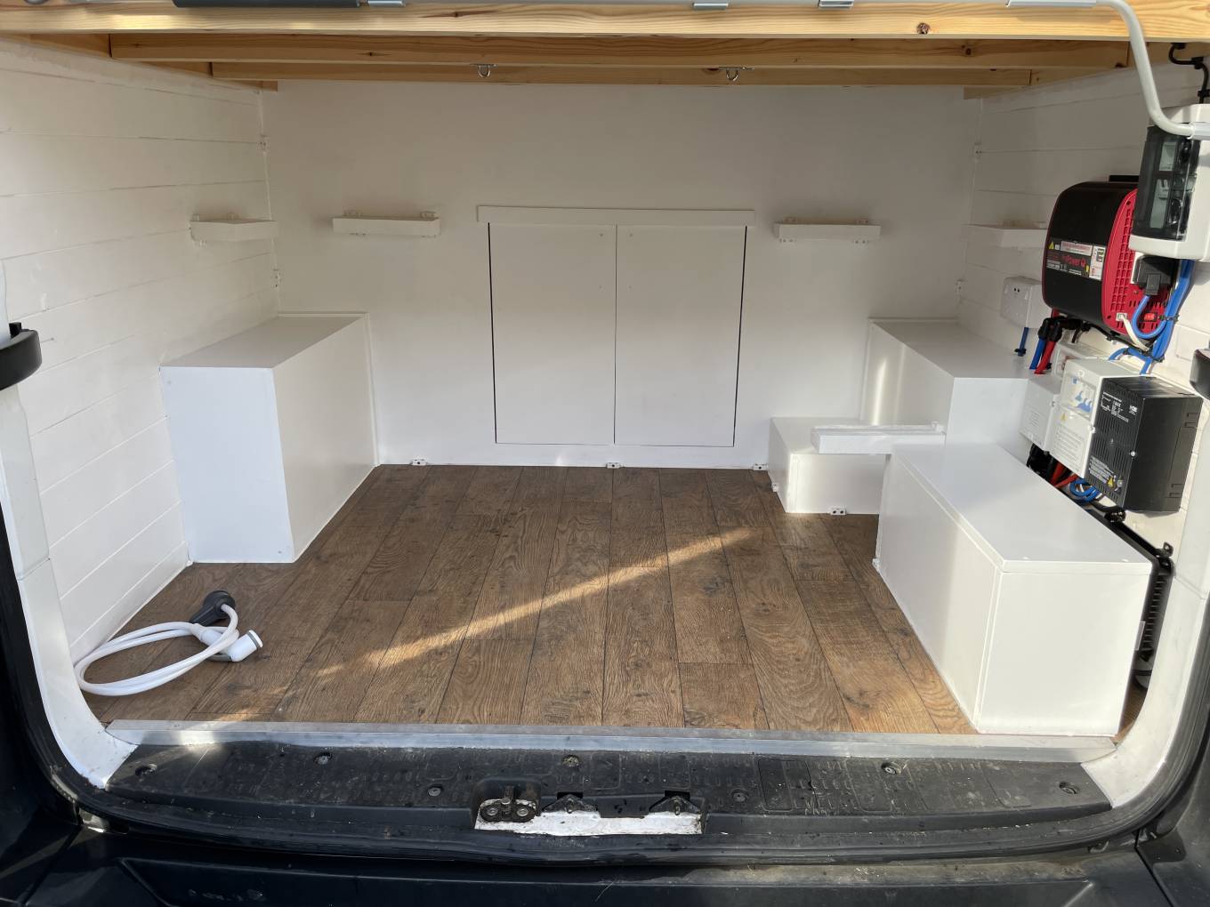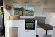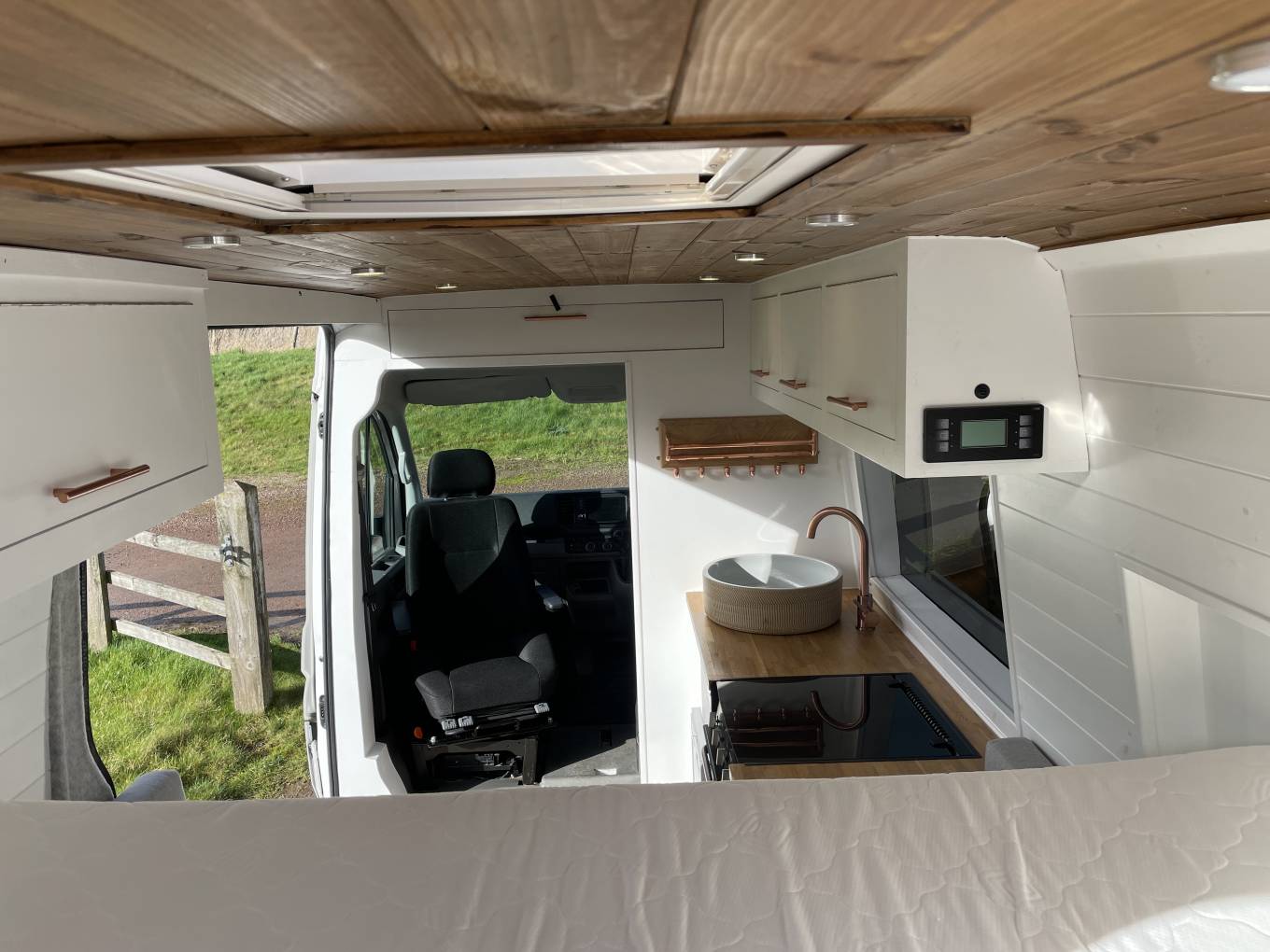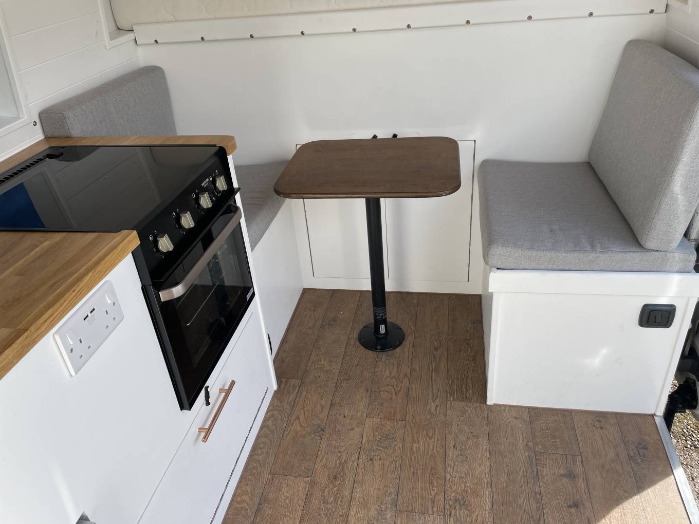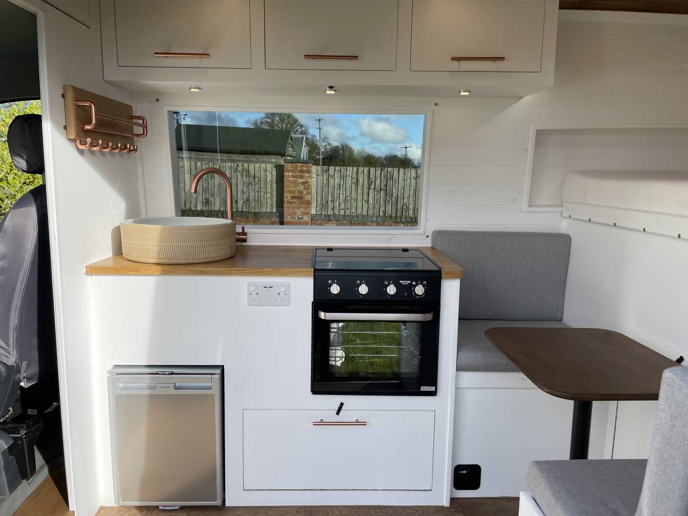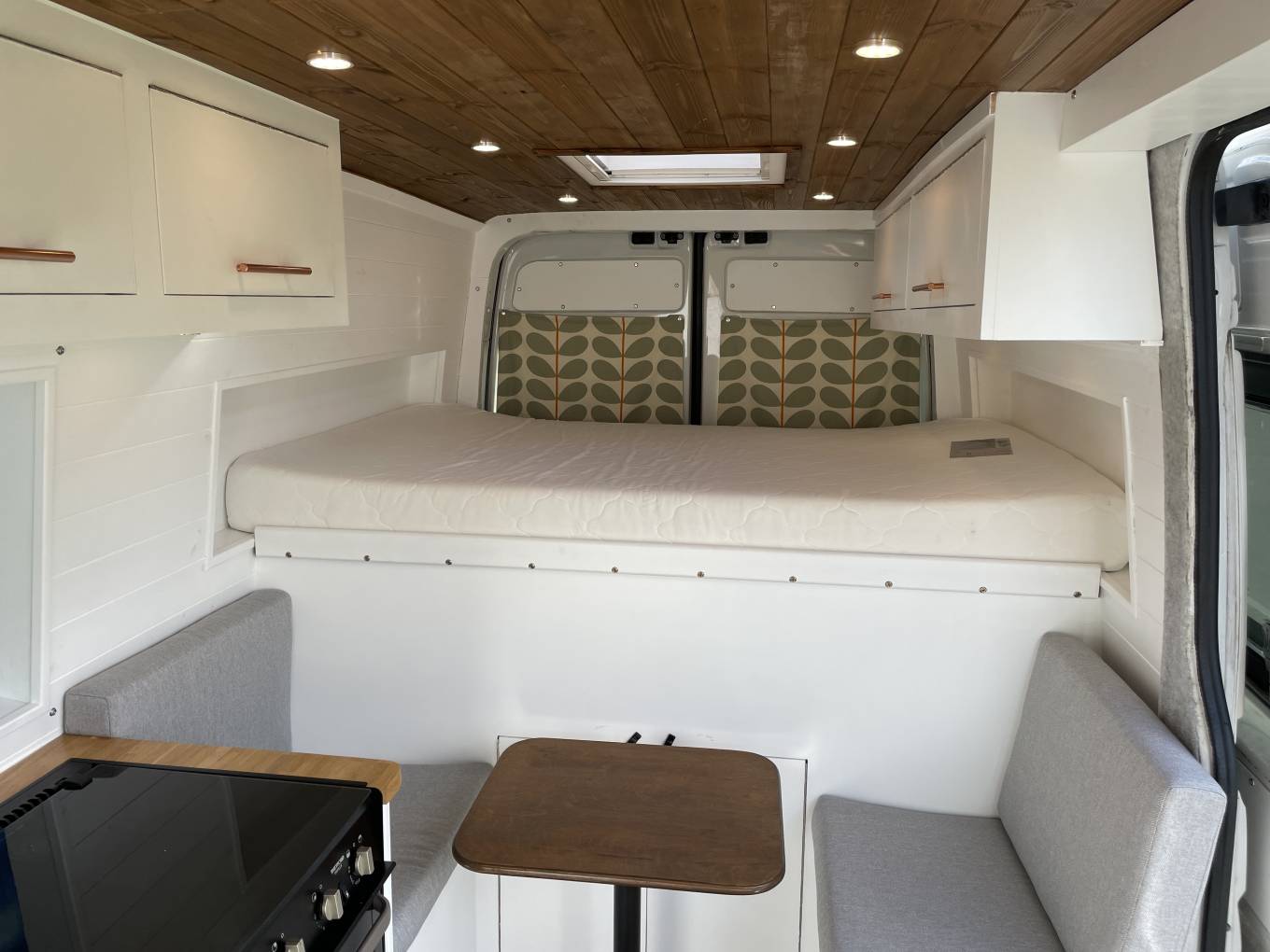 It has that ideal combination of plenty of headroom, you can stand upright in the back but as a MWB it is less than 6m in length. Converted in May 2022 by Studley Campers this van gives you everything you need for an adventure van for two all with a modern light bright airy contemporary look. At the back there is a good sized (6ftx4ft) transverse bed over the huge garage space at the back, which is all set up to slide bikes safely in there. And if you want to use this van as a mobile office as well you can go off grid with plenty of electricity from two solar panels on the roof along with 2 leisure batteries, added to that this van comes underslung refillable LPG tanks meaning this van is all ready to go away off grid for some whether for holidays, serious adventures and fun.