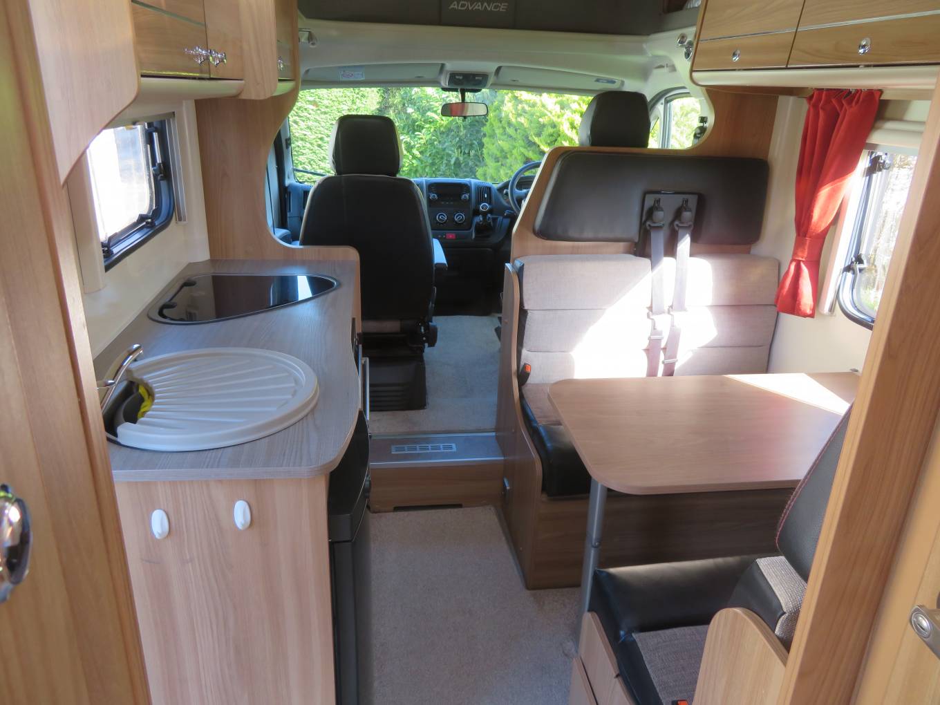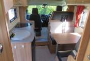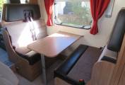 Step inside and the front dining area is immediately in front of you, with two forward and two rearward facing seats, all with 3-point seatbelts, so six travelling seats in total. There is a large dining table and this area makes up into a large double bed in the evening. Upper aircraft style lockers and under-seat storage available.