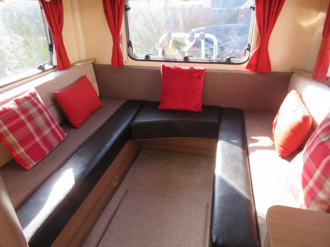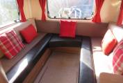 - The main feature though is the very sought after u-shaped rear lounge, with windows on 3 sides and a large sunroof that floods the area with plenty of natural daylight and fresh air. This area makes up into a very large double bed in the evening, there are upper aircraft style lockers and under-seat storage available.