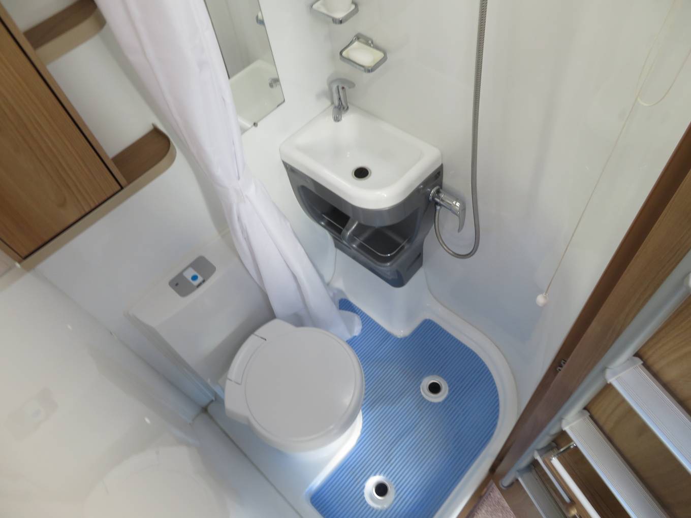 - The washroom is quite spacious for a six berth motorhome, a wall mounted wash-basin with chrome mixer tap, a Thetford cassette swivelling toilet with electric flush, a separate tap supplying the shower handset, plus a shower curtain. A wall mounted cabinet is located above the toilet.
