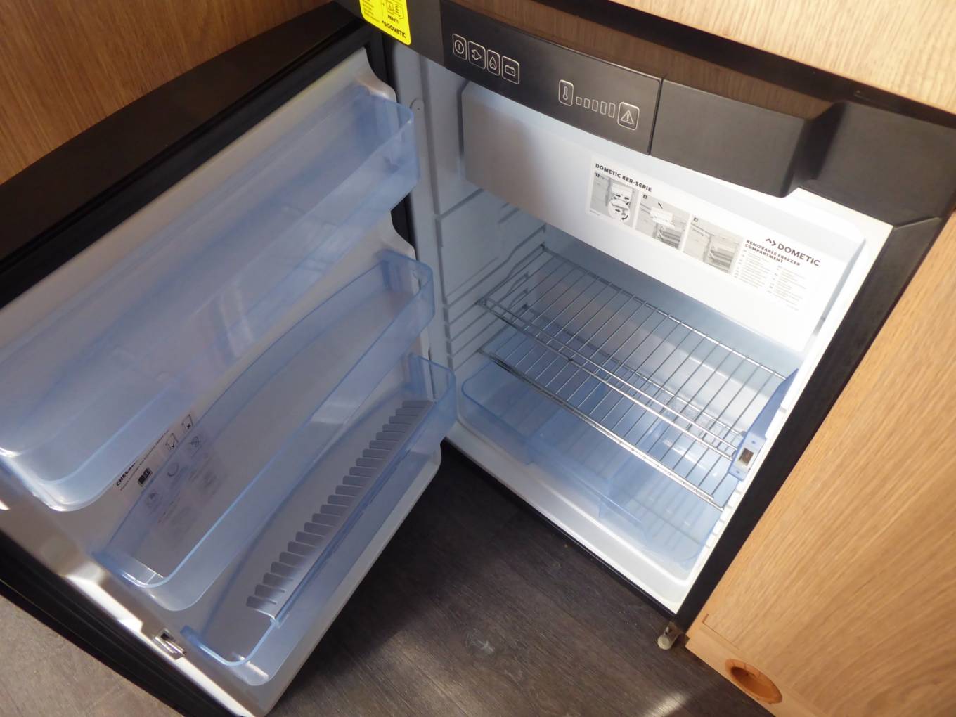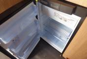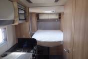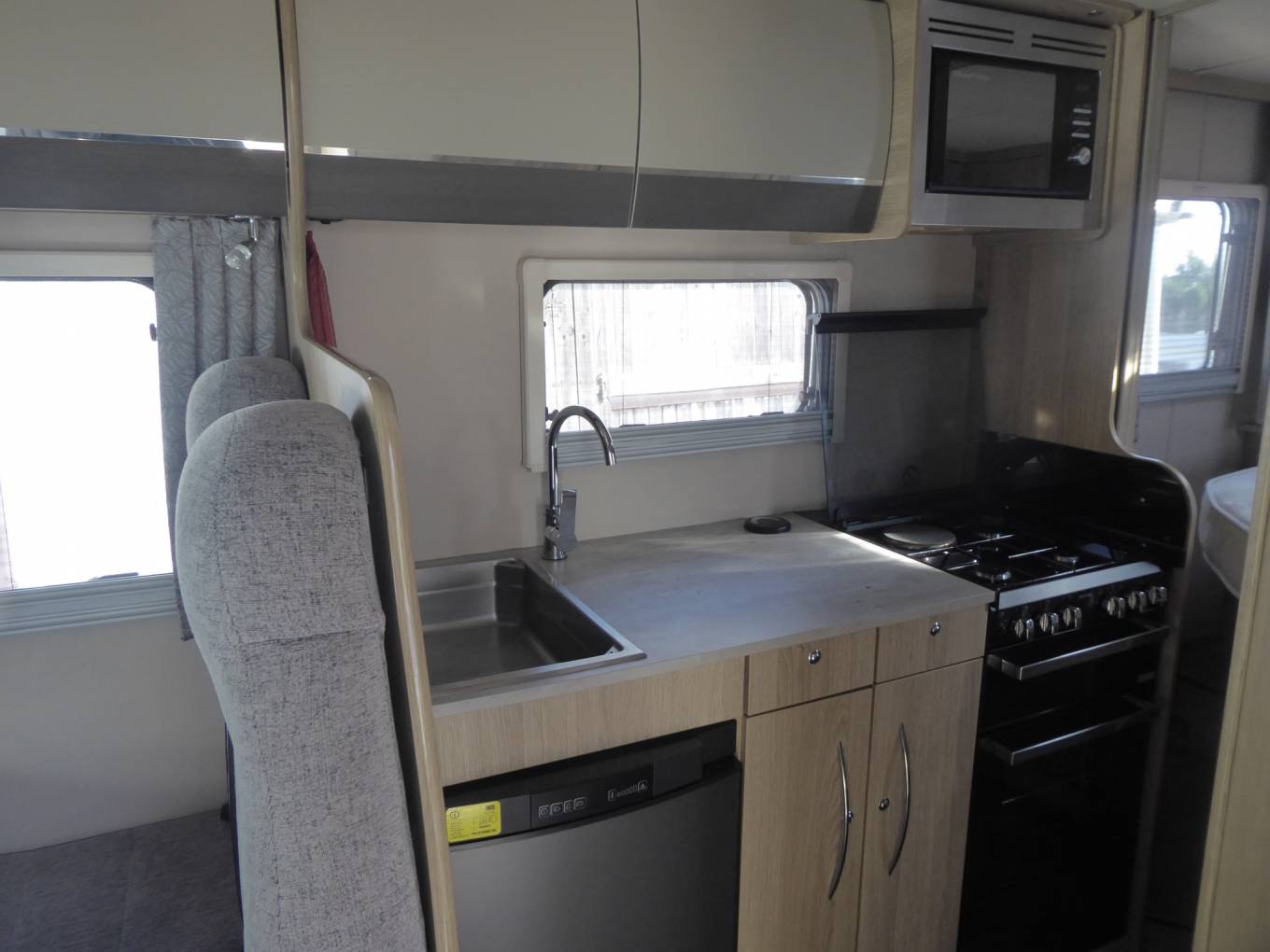 Conveniently adjacent for food storage and preparation, is the offside central kitchen, complete with a sink, an oven, a grill, a hob with 3 gas burners and 1 electric plate, a microwave, and a fridge with a freezer box.