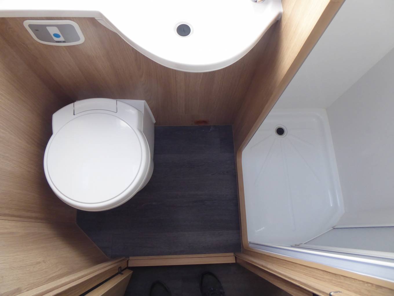 Opposite the kitchen is the bathroom, with a toilet, a hand basin, and a shower cubicle.
