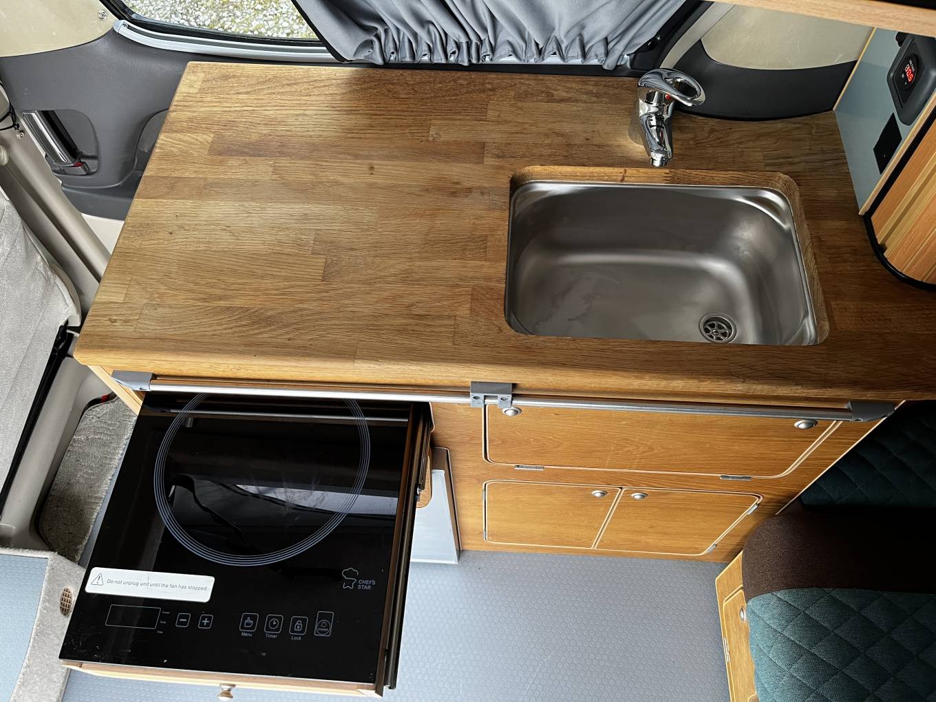seats from the front, Rock and Roll bed and space in the roof for another Mattress. Kitchen area is equipped with Induction hob,