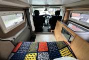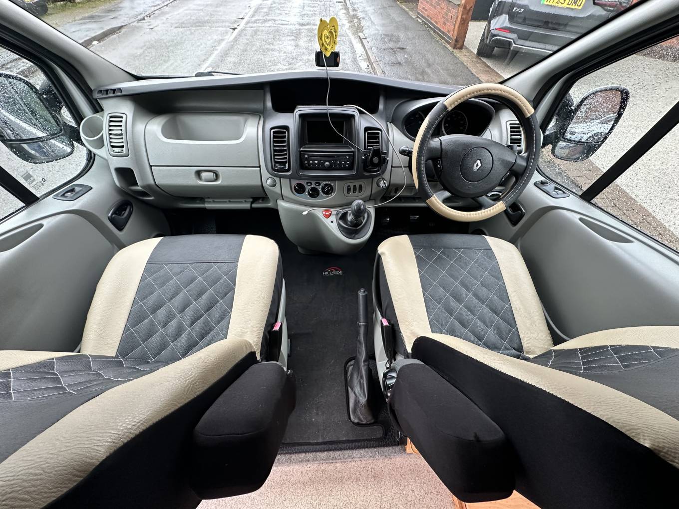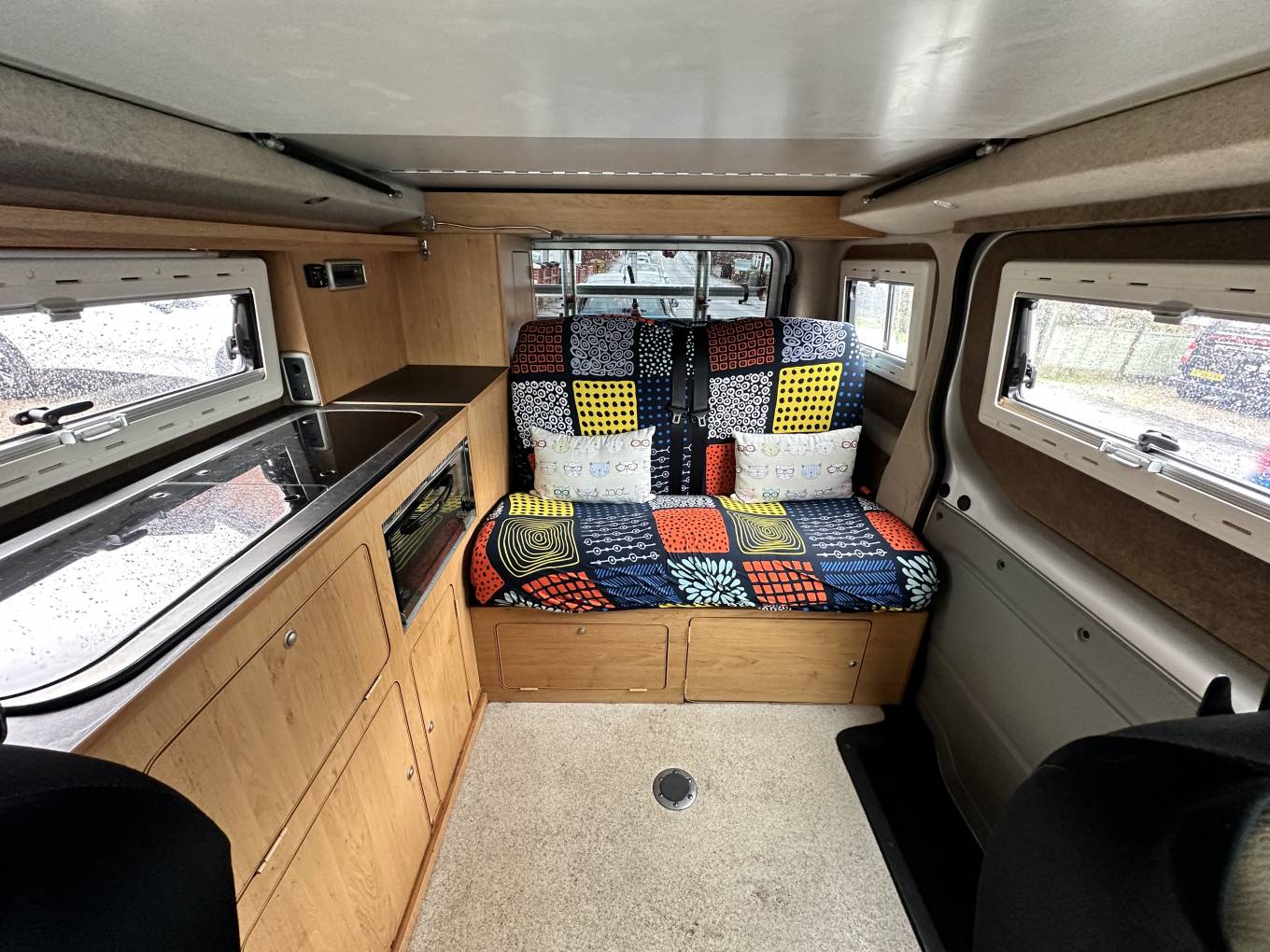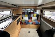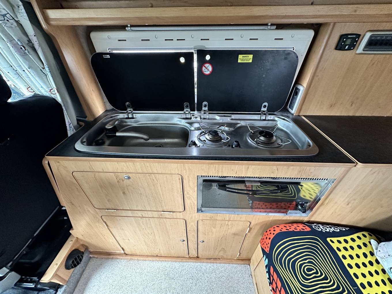 Firstly, we start at the rear seats which features 2 seat belts and converts to a comfortable rock and roll bed with ease. Next, is the well equipped kitchen area. This is includes a 2 ring gas hob, wash basin with hot and cold water, grill and a good sized chest fridge. The passenger seat swivels making this area a great dinette space.