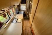 The kitchen comes fully equipped with everything you’ll need for cooking on the road, including gas hobs, fridge/freezer, oven grill and sink.