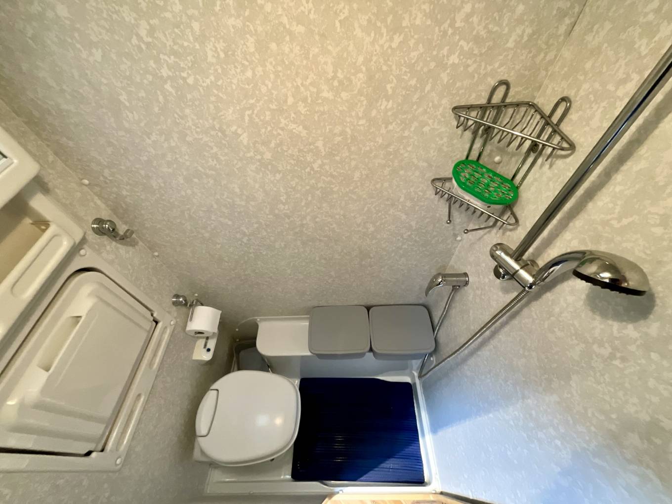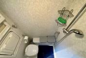 A spacious washroom comes fully equipped with adjustable shower, fold out washbasin, and additional storage.