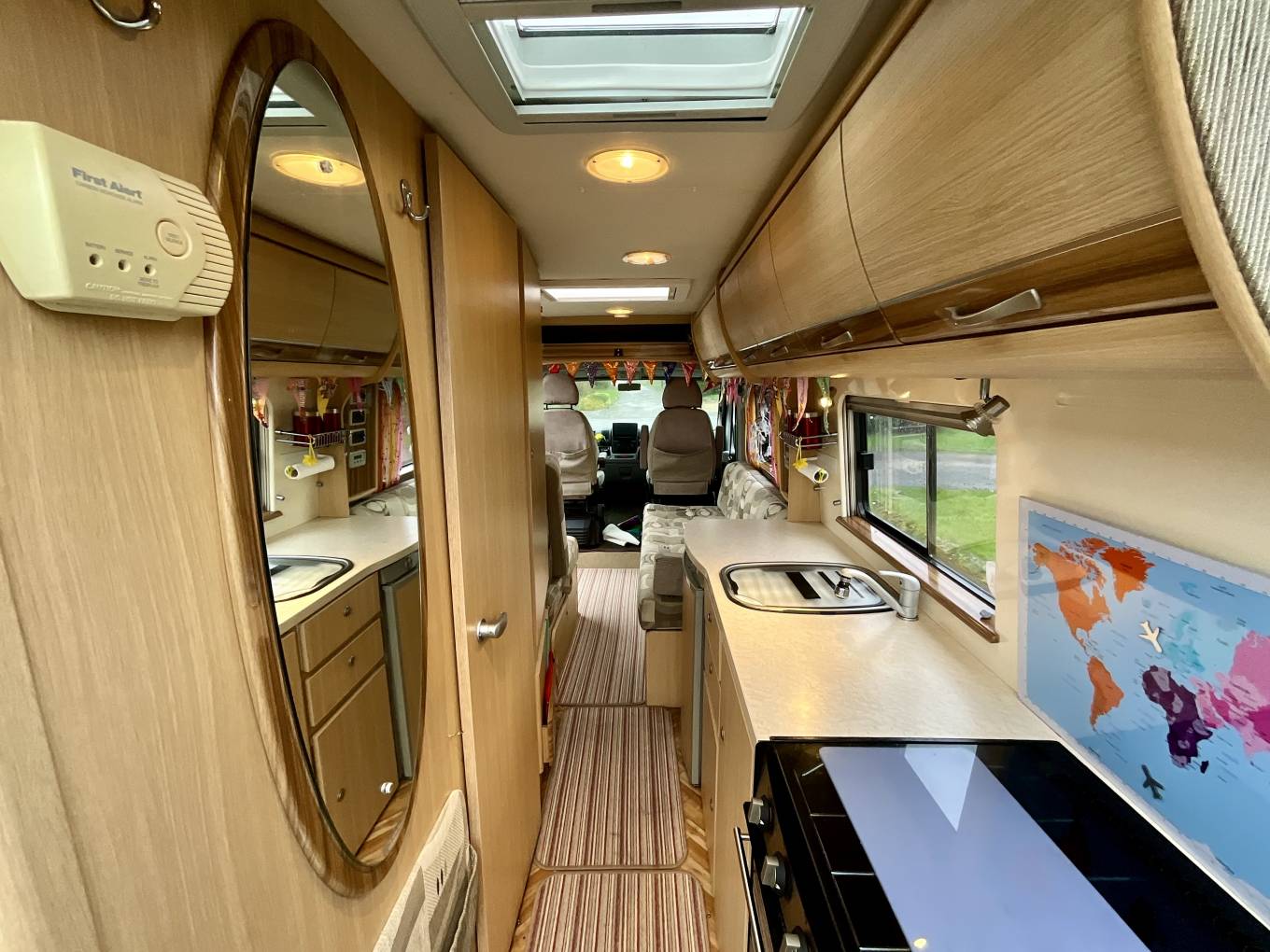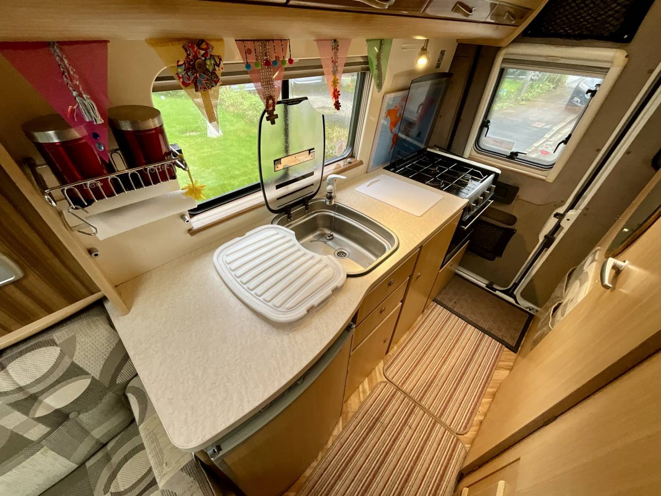The driver and passenger seat swivel round to face a comfortable, spacious lounge which can comfortably seat five, and a freestanding table is included for socialising and meal times.