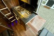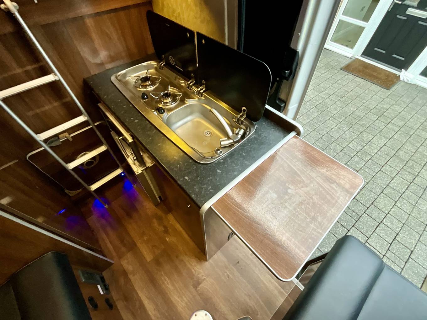 The kitchen comes fully equipped for everything the travelling chef needs, including gas hobs, sink with water pump, microwave, fridge and freezer.