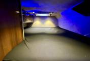 The front L-shaped lounge can comfortably sit four, and is illuminated by LED and ambient lighting, coupled with a Heki skylight at both the front and rear of the van. At night, the lounge can be quickly converted into another single, forming a three berth motorhome.