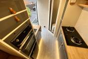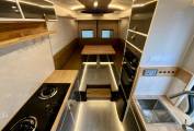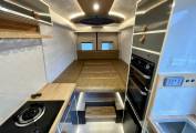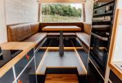 The kitchen based in the middle of the camper comes fully equipped with two gas burner hobs, large fridge, Thetford oven and grill, an extractor fan and a sink with hot and cold water.