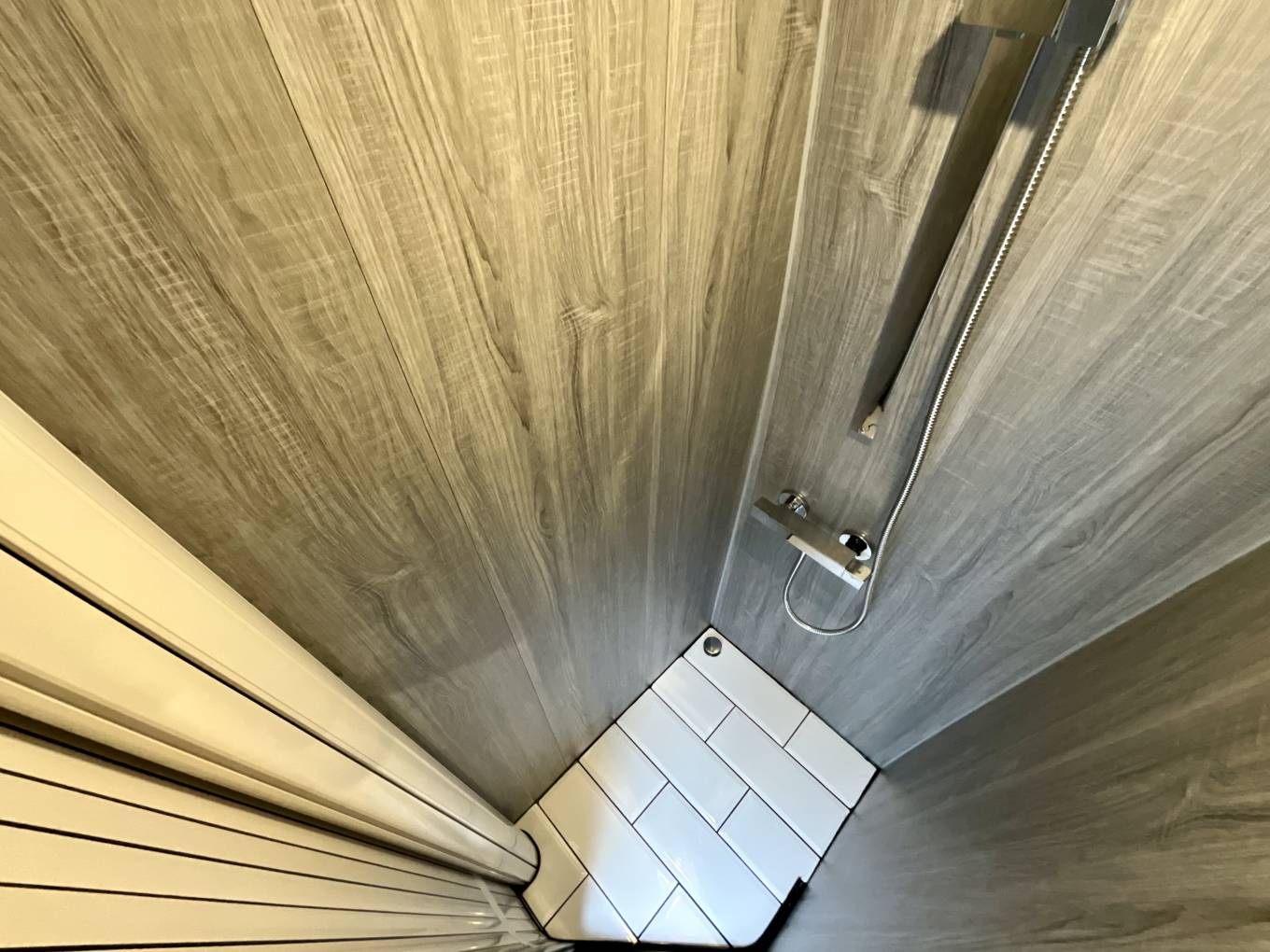 At the front of the habitation area, a spacious washroom is based, with an adjustable shower. A PortaPotti comes with the campervan.