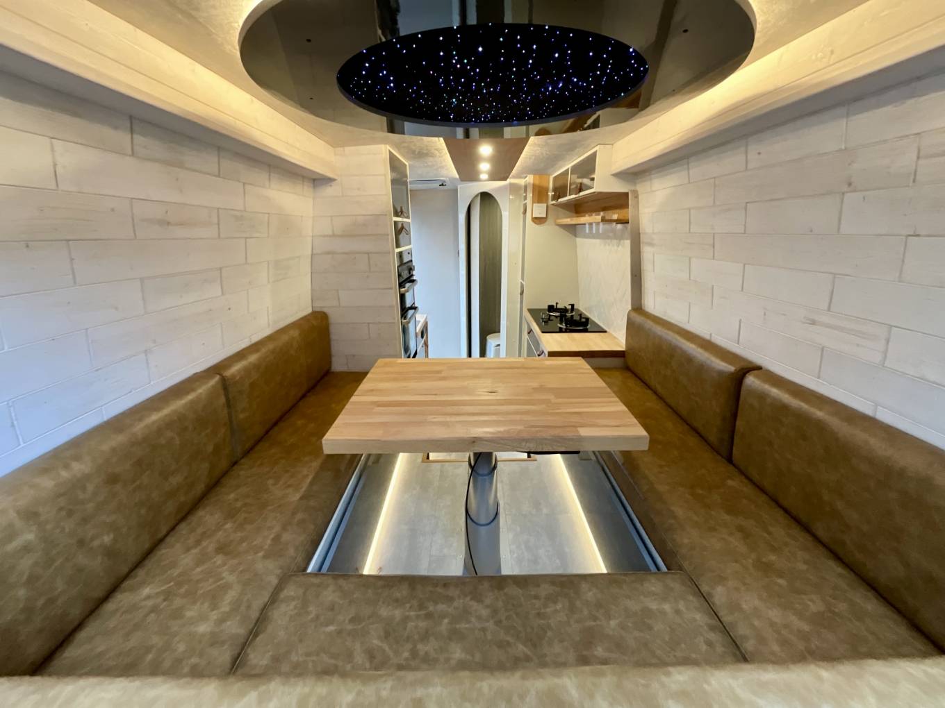 The rear lounge layout can comfortably seat six, and features and adjustable table for socialising and mealtimes. At night, this section can be easily and quickly made up into a sizeable double. A fantastic feature is the projector that slides out and projects onto a pull down screen at the back of the campervan.