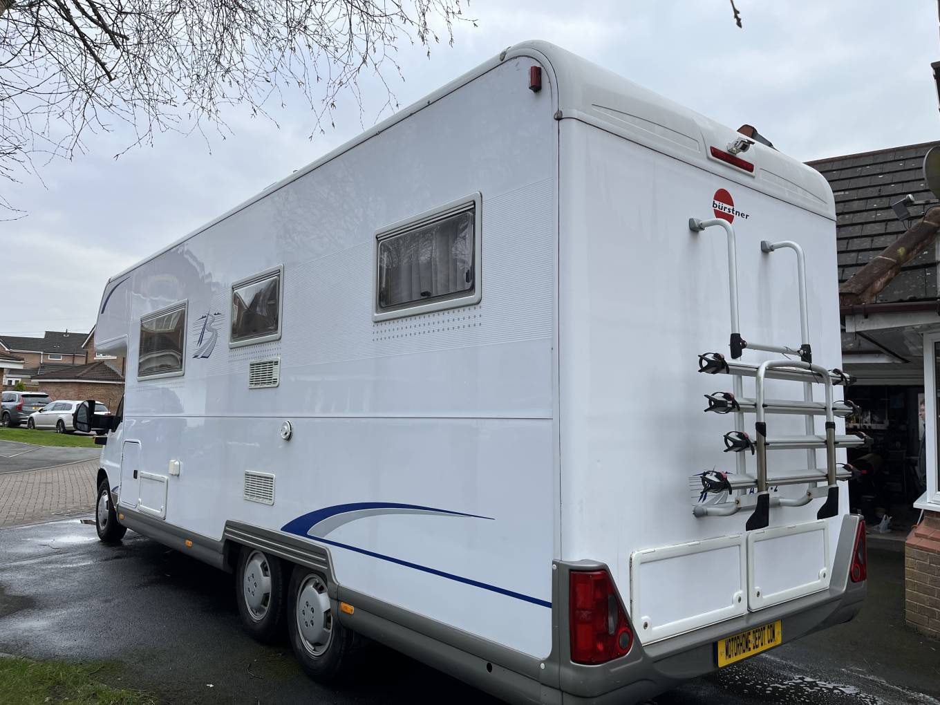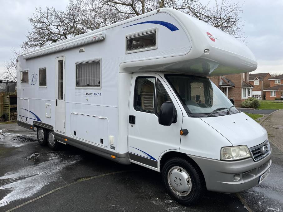 Burstner Argos A747 - 2 with Fixed Rear Bed, Garage and large under floor storage. A great example of this large 6 berth family motorhome with good service history, current Hab Check, one previous owner and just 40,442 miles on the clock. This is a quality built German motorhome designed to cope with all kinds of weather conditions with an insulated double floor and Alde wet heating system. At the rear there is a fixed double bed under which is the garage, forward from this is the bathroom with seperate shower compartment and next to this is a well equipped kitchen. At the front is the lounge area with a large settee and dining table and there is a large double bed over the cab. It comes with 6 Seat Belts, Cab Air Con, Alarm, Rear Camera, TV, Canopy Awning, Electric Step, Bike Rack and Drive Away Awning. It also comes with Gas Bottle, Mains Lead and 2 sets of keys. An excellent example available for viewing by appointment in Preston, call for more photos, videos and information.
