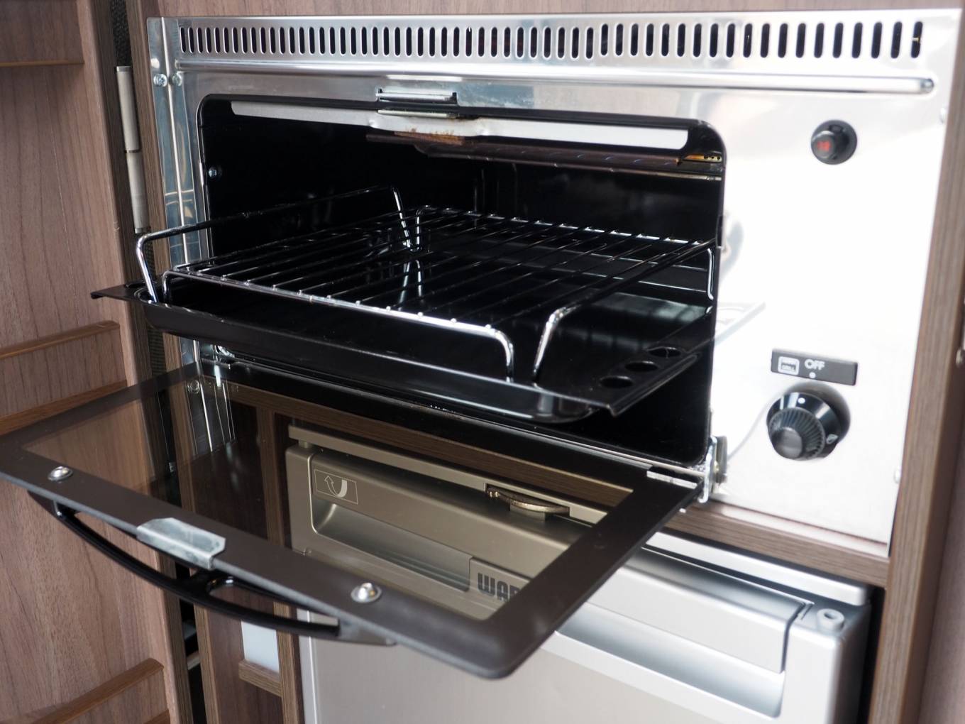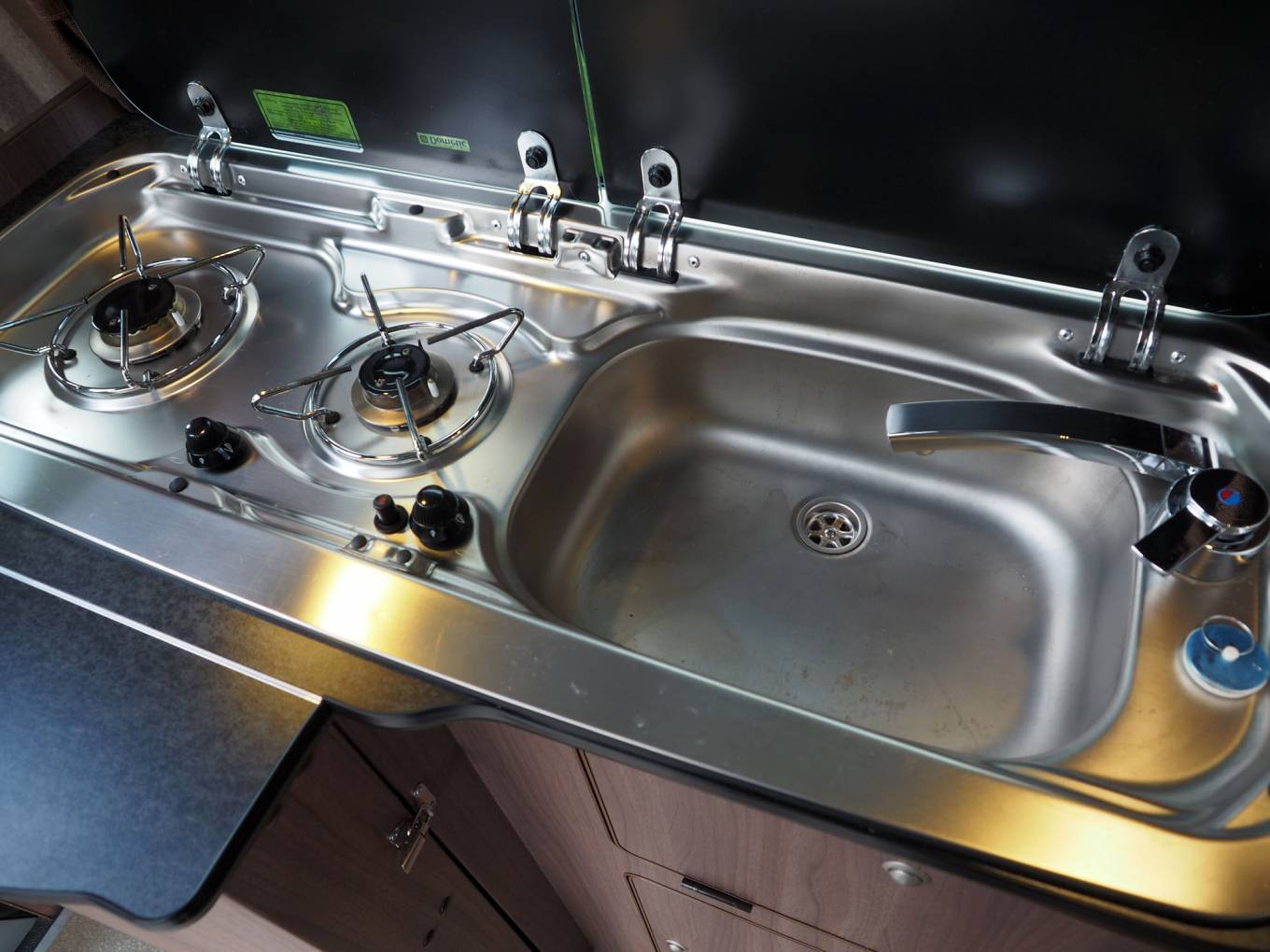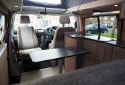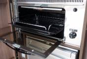 The fridge and grill are neatly concealed behind a furniture door which has recessed shelves for spices and condiments. Throughout this camper there is attention to design detail, with a surprising amount of storage cupboards and shelving.
