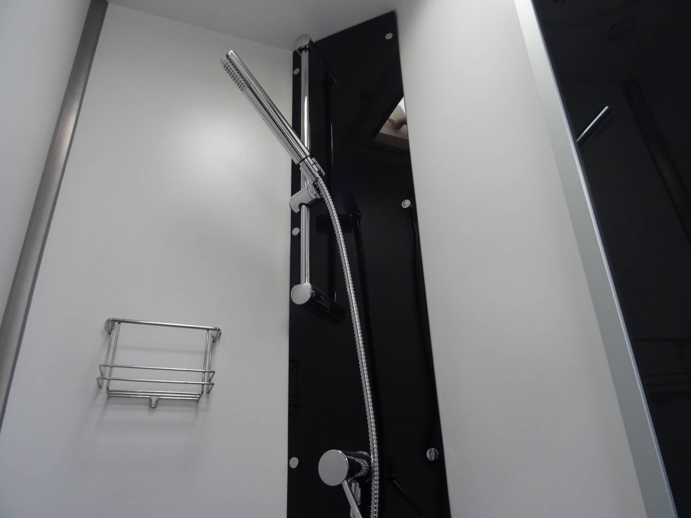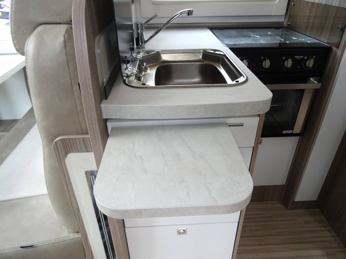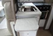 Moving up, the washroom and unused shower are separate and there is a stylish slide door to separate this area from the kitchen. The kitchen is fully equipped with a large Auto finder 3 way fridge freezer, Thetford Oven/Grill (unused) 3 Gas burner Hob, microwave, sink, mixer tap, work top extension, extractor fan, overhead 2 way fan, good all round storage including a large slim line pull out rack.