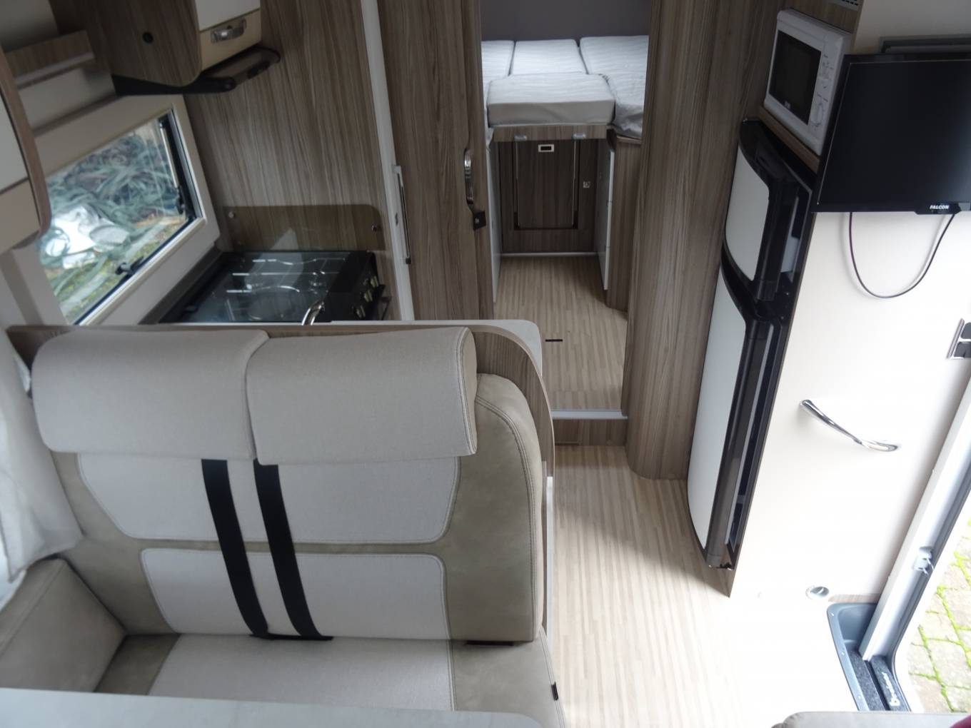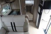 Both cab seats swivel, we have side and forward facing sofas and the forward seats are belted - all making for a very comfortable lounge/dinette. The solid table extends and is removable. There is an electric drop down bed above this area (230 kg load capacity) and a TV. Blinds and fly screens are fitted throughout including Habitation door, heating/hot water is Truma, gas and electric blown air (including garage). Lighting is strip and spot and in the bedroom there are reading lights, with USB charging.