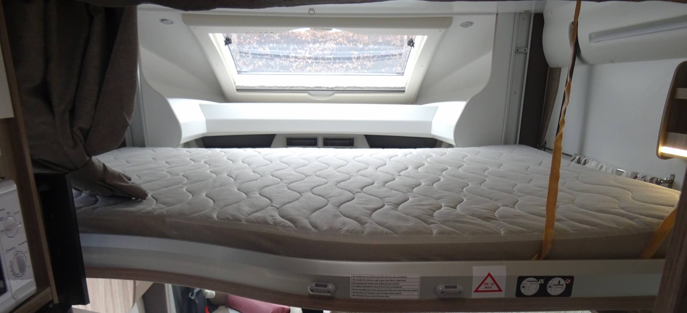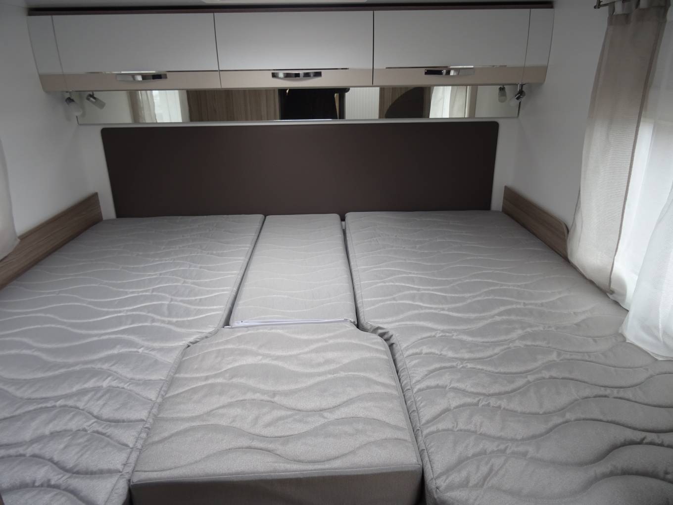 At the rear we have fixed twin German style single beds with a pull out in fill for a large double bed. There are pull out steps up and through access to the garage, large under bed wardrobe, under bed drawers, 3 high quality overhead lockers, a TV point, ceiling speakers, windows and sky light.