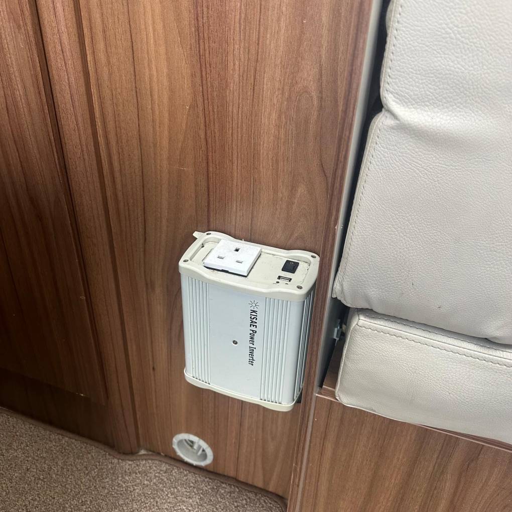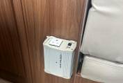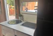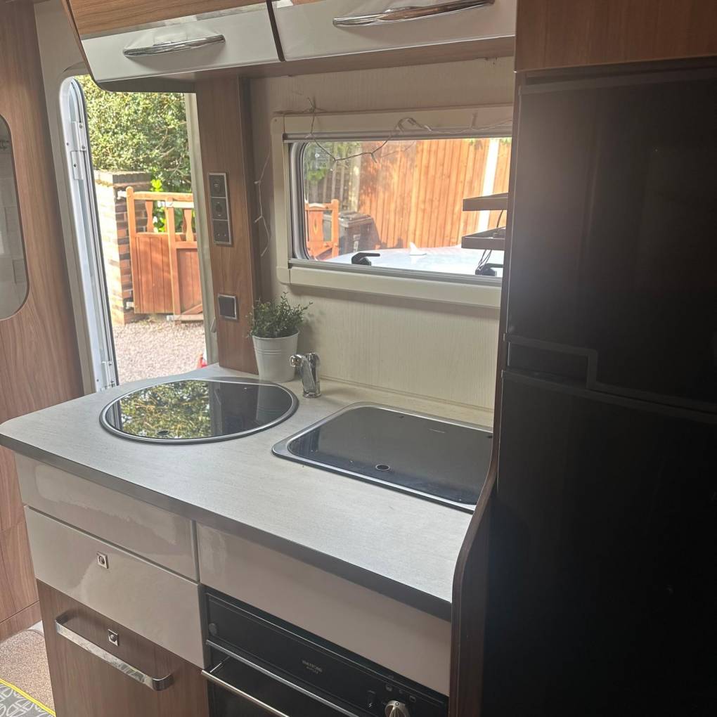 Moving rear is the galley kitchen which consists of a stainless steel sink with chrome mixer tap; 2 burner gas hob, below is a Thetford Oven and grill. There is plenty of cupboard and drawer space for all your holiday utensils and provisions. The fridge is a large Dometic absorber unit with separate freezer compartment. This is fully automatic and can be powered by: 240v; 12v or gas depending whether you are plugged in on site or wild camping. There is also a Microwave for use when plugged in on site.