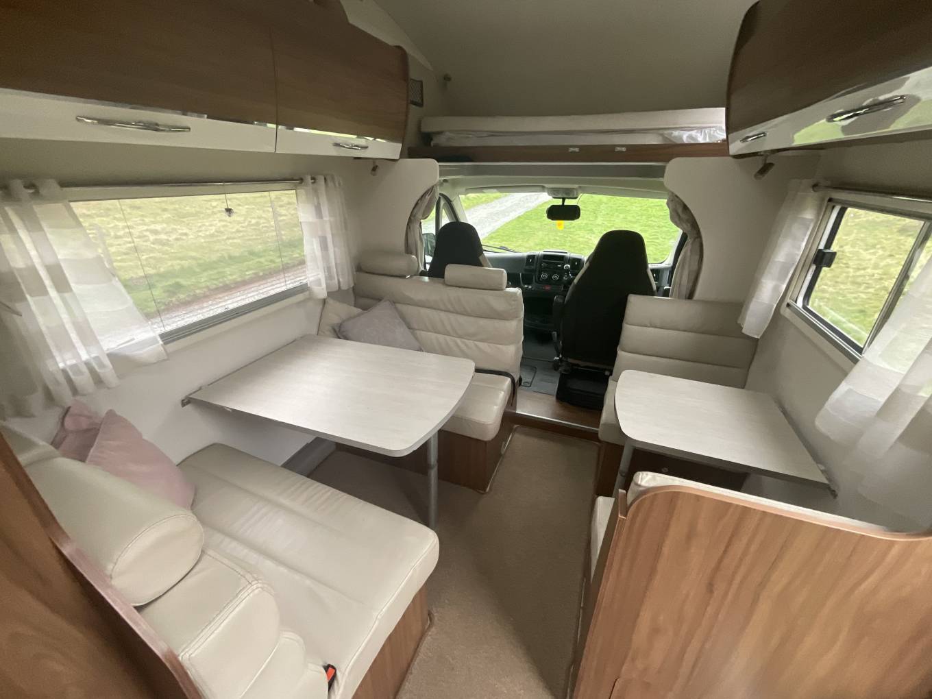 We enter the motorhome on the drivers side immediately to the right is the double dinette area. This consists a small 2 single seats with table to the right of the habitation door, opposite is the larger of the two dinettes that has a forward facing 2 seater settee, fixed table and a rear facing 2 seater settee. Both these seats have 2 seat belts each. The forward facing ones are 3 point lap and diagonal belts. At night this area makes up into a small double bed by dropping the table and using an infill cushion. There is a TV point to the rear with a flatscreen Avtex TV which can be used in conjunction with a Maxveiw sat dome or a conventional aerial.