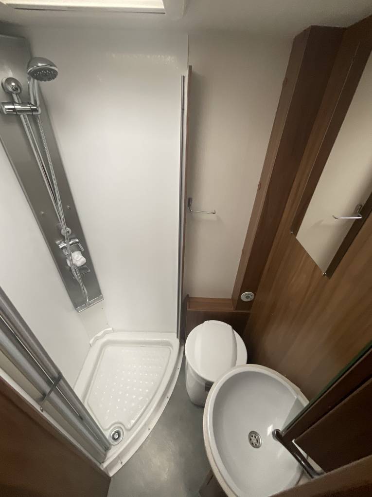 Opposite is the large bathroom which consists of: a separate shower cubicle with Perspex doors to close and a chrome mixer and shower head on a chrome riser; the toilet a Dometic cassette style with fresh water flush and swivel head; a white corner sink with chrome mixer.