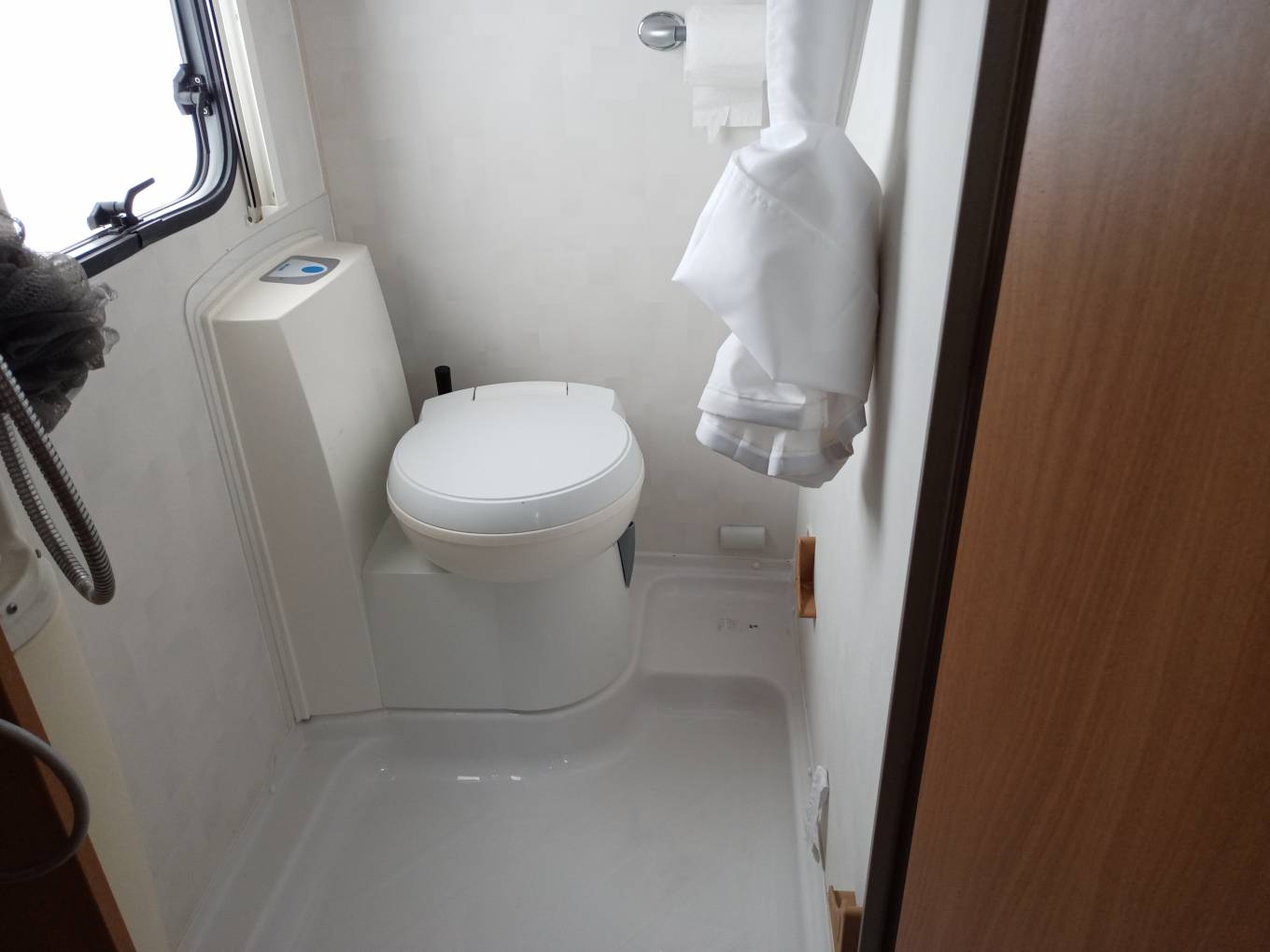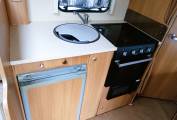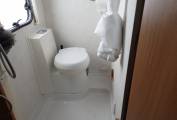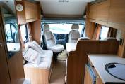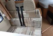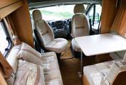 2.2 litre base unit Fiat low profile cab and weighing in at a licence-friendly 3.5T, offering 4 belts and berths. Both cab seats swivel, there is a sofa to the nearside and together with the belted forward facing dinette seat and cab seats offer a social space to seat six. The dinette and adjacent sofa convert to another double berth. The washroom is clean and quite spacious.