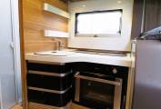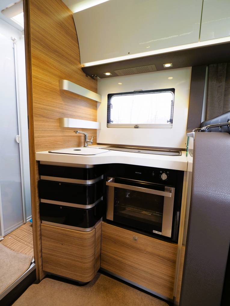 Moving to the rear of the van, you will next come across the kitchen space, spreading across both sides of the van, with a full fridge and separate freezer, microwave, sink with mixer tap, 3 x gas burner hob and an oven with grill and plenty of draw and cupboard space the kitchen is fully equipped to allow for the cook to make up many a meal.