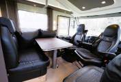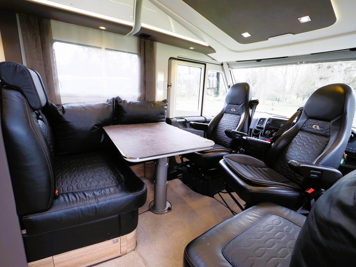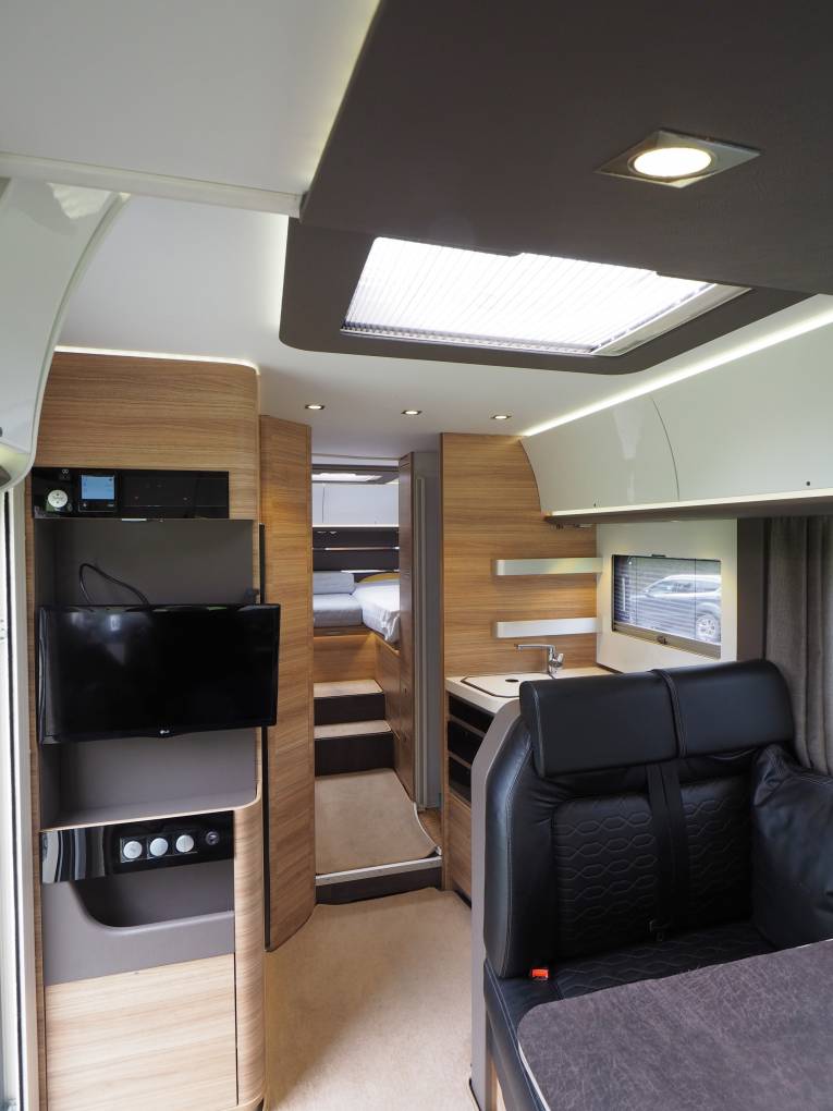 Stepping inside the van, you are first greeted by the large dinette and cab area, with 2 x captain chairs to make up more space around the dinette, there is space for the whole family to gather at meal times. The table is adjustable, so can be moved as required. Seating is heated and in a stunning soft black leather upholstery with white leather walls to compliment and LED mood lighting and sunroofs to give you plenty of light at all times of the day.