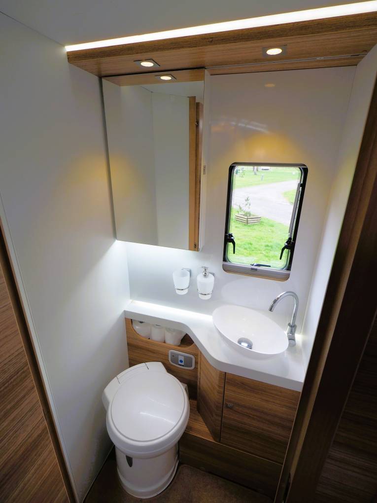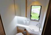 The washroom is also on both sides of the van, with the toilet and vanity style sink with further storage cupboards and large bathroom style cabinet and mirror, it is very modern and bright. The separate shower is across from this and when the toilet door is open, gives you privacy away from the rest of the van with space in the bedroom to change.