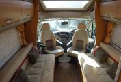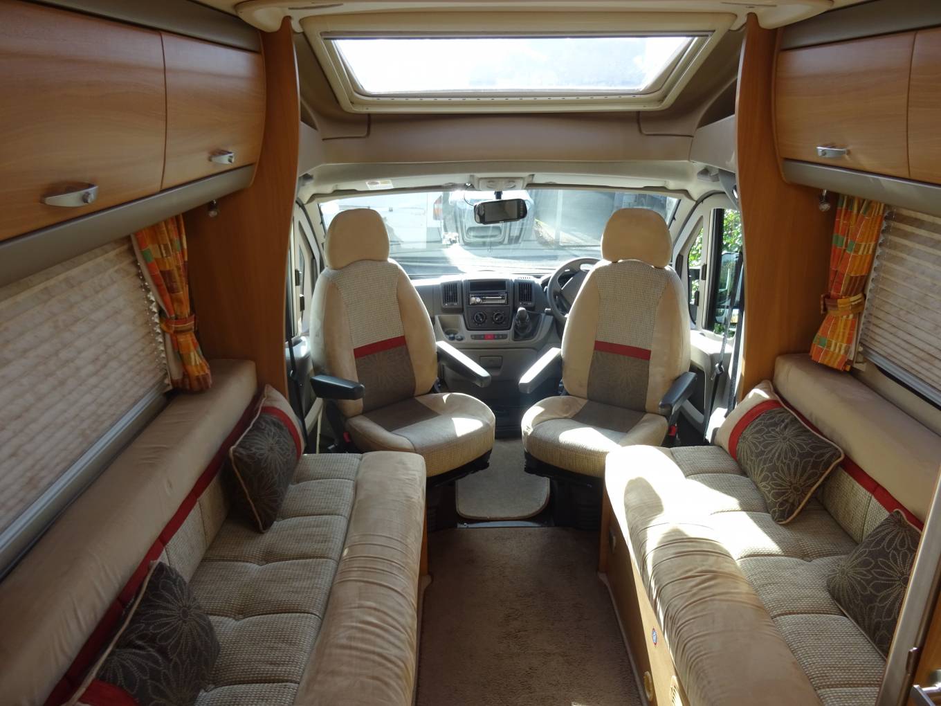 Moving up there are facing sofas that easily convert to a double bed although with the cab seats swiveled round you can have 2 singles if preferred. With the table in place this all makes for a very comfortable lounge/diner. Heating and hot water are Truma on gas and electric. There are blinds and fly screens throughout including the Hab door and curtains in the lounge and skylights. There is further storage under the sofas, accessible from one side through an external hatch.