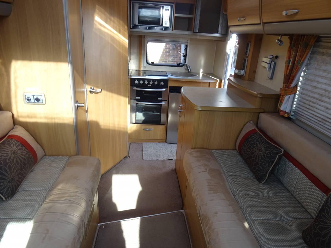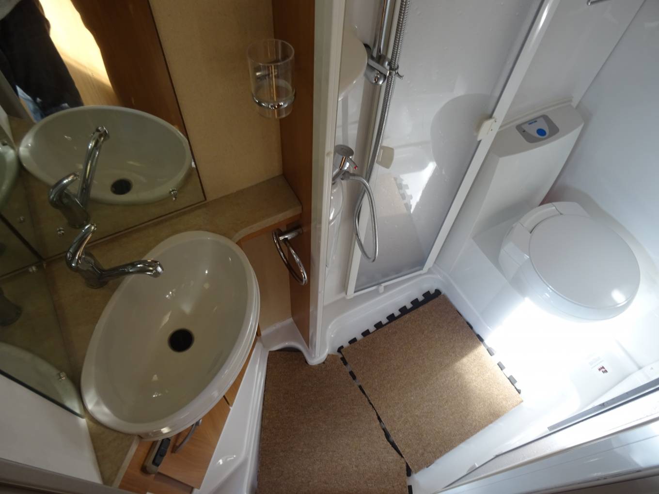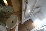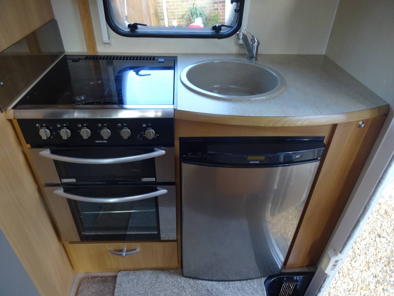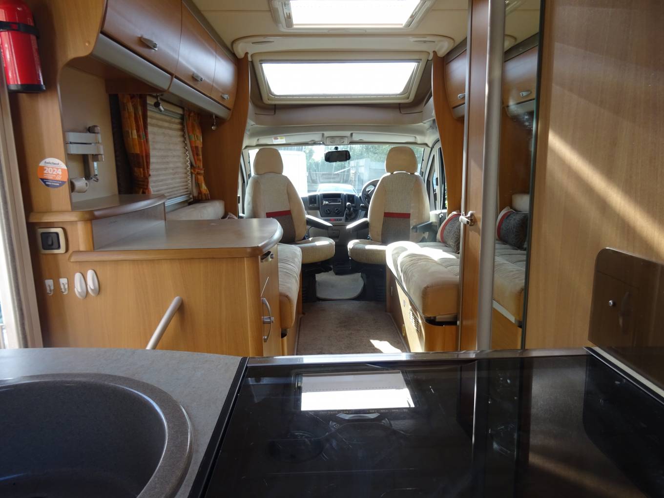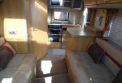 The Motorhome is End Kitchen, fully equipped with Thetford Oven and Grill, 3 Gas burner hob and electric plate, microwave, sink, mixer tap, worktop, 3 way fridge with freezer box, overhead units, slimline storage cupboard for the table, extra work station and storage to the side, with sockets, TV point and bracket. Also at the rear is a large washroom with 2 separate solid bi-fold doors for the shower and toilet, there is a wash basin and storage. Adjacent to this is a large hanger wardrobe.